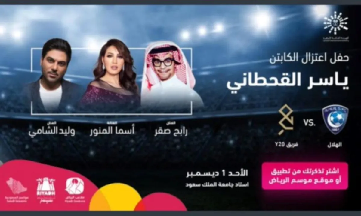 تُطرح اليوم تذاكر مباراة اعتزال الكابتن ياسر القحطاني، نجم فريق الهلال والمنتخب السعودي السابق، ضمن فعاليات موسم الرياض 2019، بحفل فني ساهر.