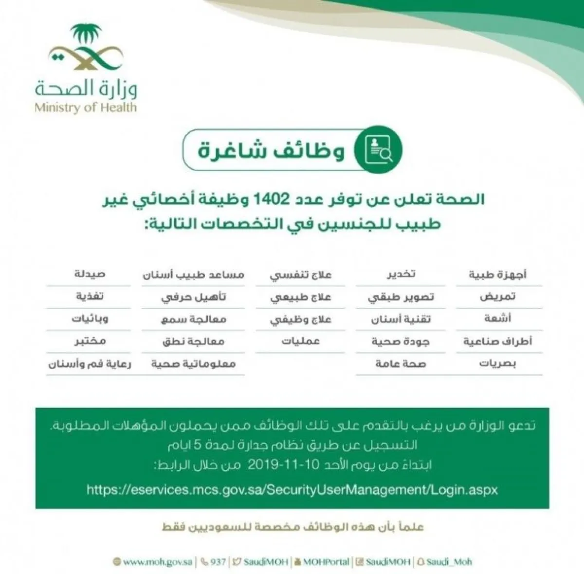 أعلنت وزارة الصحة تمديد التقديم على وظائف "صيدلي و أخصائي غير طبيب" المطروحة للجنسين حتى يوم الخميس المقبل 21 نوفمبر 2019، وذلك للمرة الثانية.