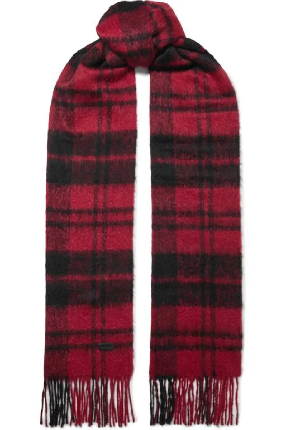 وفي هذا السياق أعجبنا السكارف الناعم من Saint Laurent الذي جاء باللون الأحمر الداكن مع القليل من الأسود، حيث قُطع السكارف إلى أشكال هندسية منتظمة.