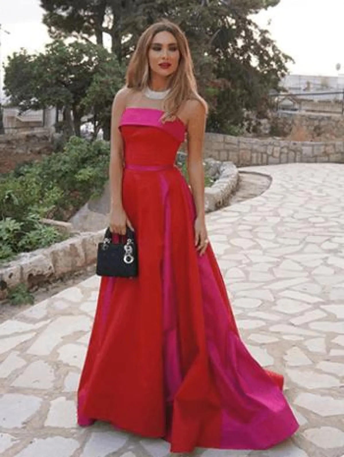 ستيفاني صليبا في فستان باللونين الأحمر والزهري