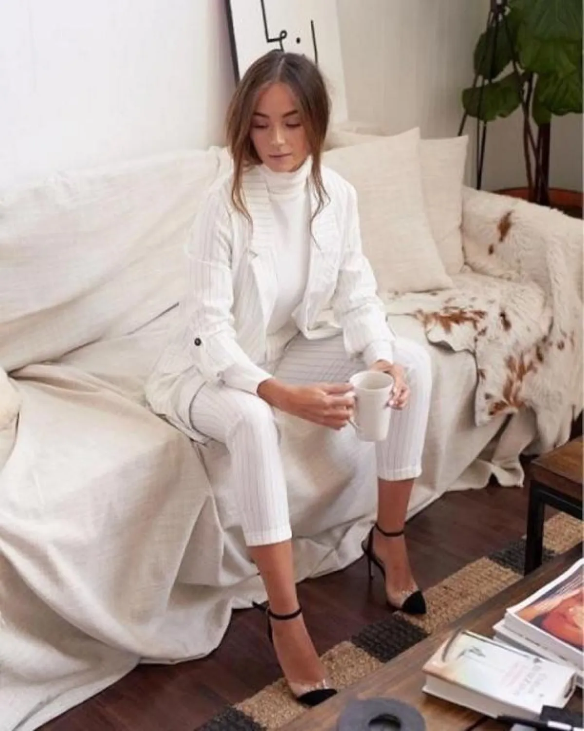 نسقت Tuti Vargas بدلة كاملة باللون الأبيض المقلم بالأسود مع توب خفيف باللون البيض وانتعلت حذاء بكعب عال، أيضا اتجهت الفاشينستا إلى تنسيق السويت شيرت مع بنطلون جل باللون الأسود.