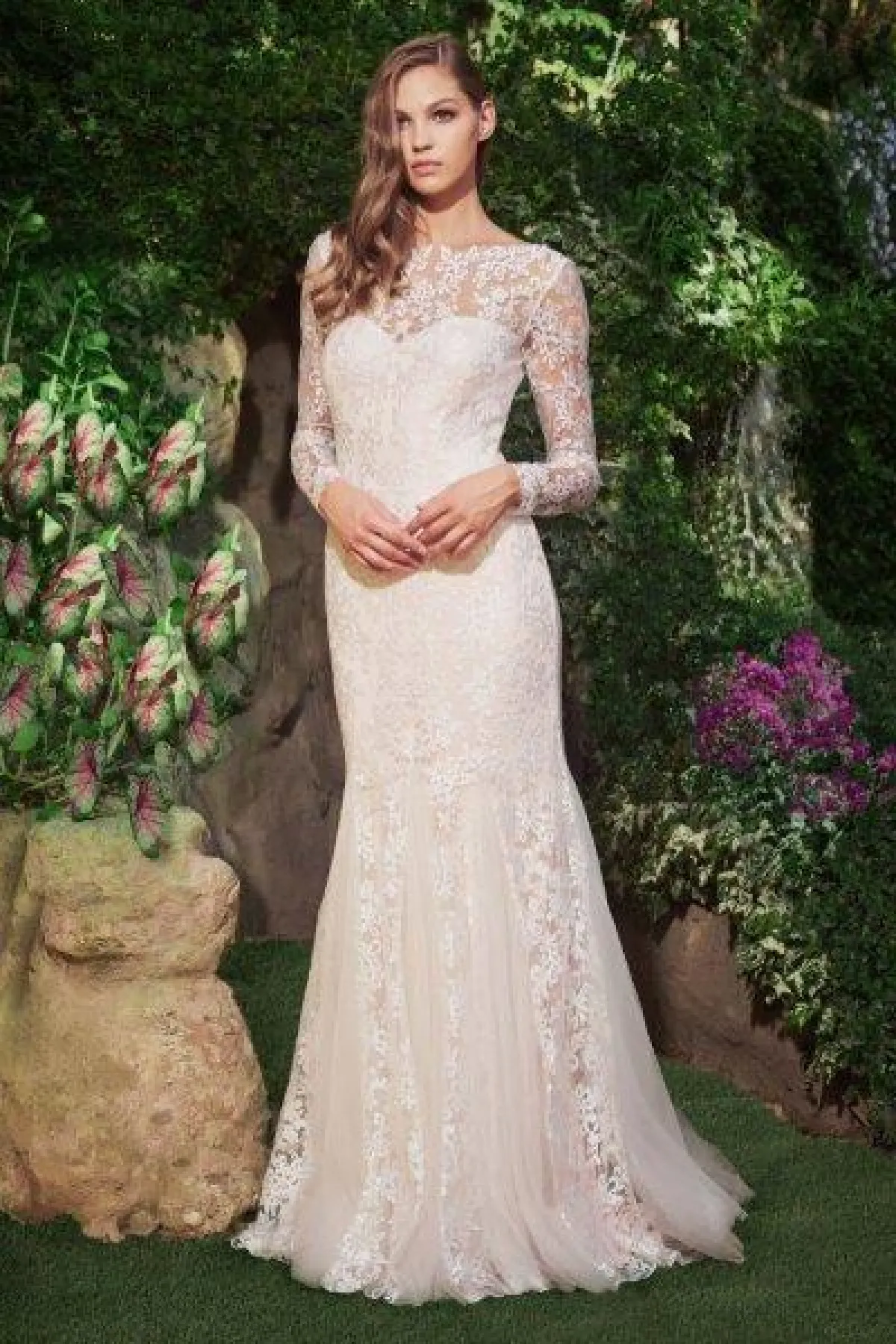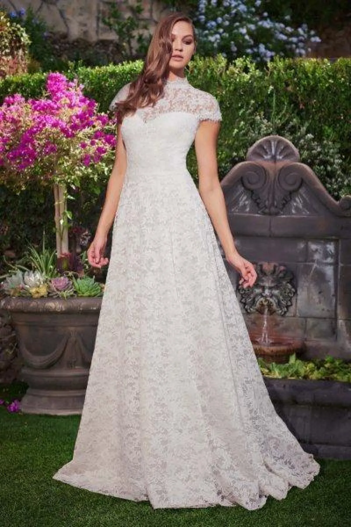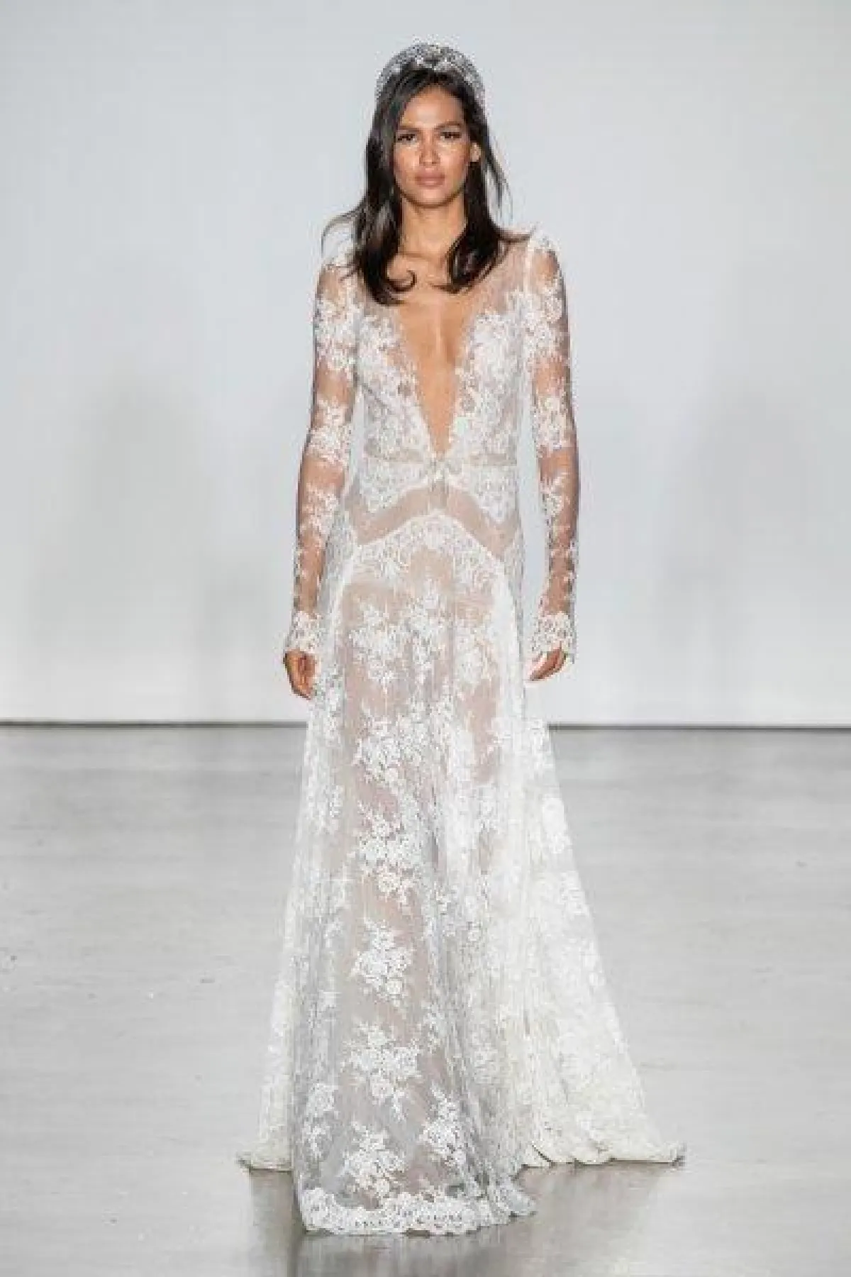 كما قدمت ماركة تاداشي شوجي Tadashi Shoji فساتين زفاف دانتيل بأكمام طويلة وقبّة مرتفعة وبتنورة عمودية أو تتسع تدريجياً من أسفل.
