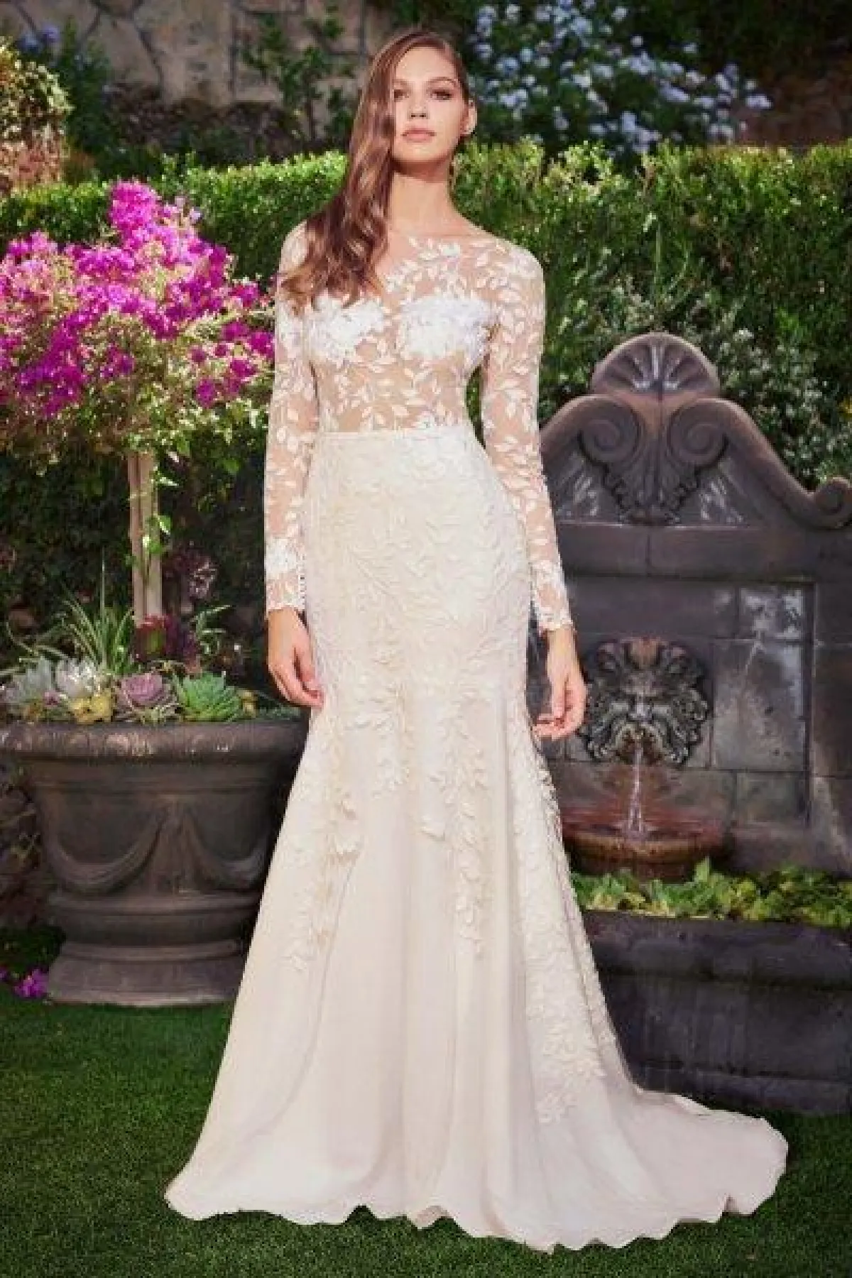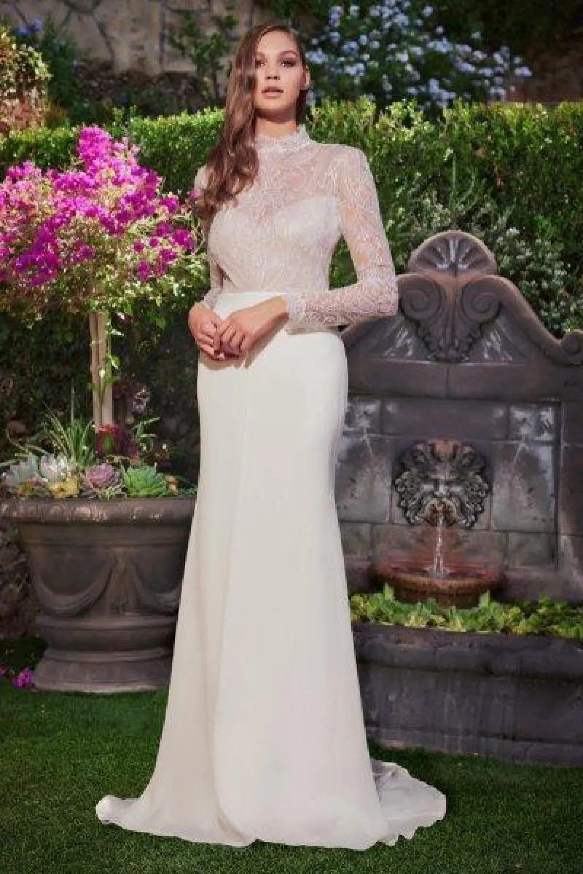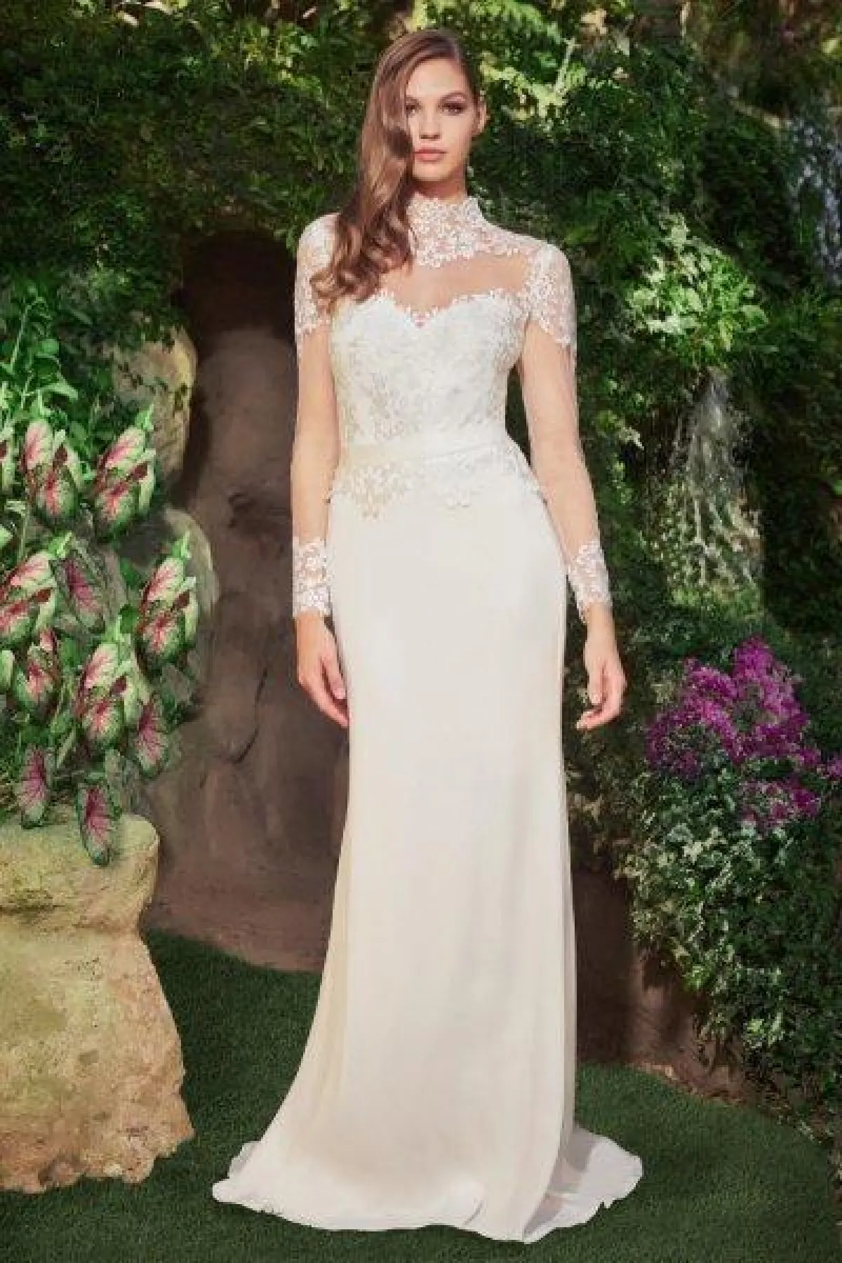 كما قدمت ماركة تاداشي شوجي Tadashi Shoji فساتين زفاف دانتيل بأكمام طويلة وقبّة مرتفعة وبتنورة عمودية أو تتسع تدريجياً من أسفل.