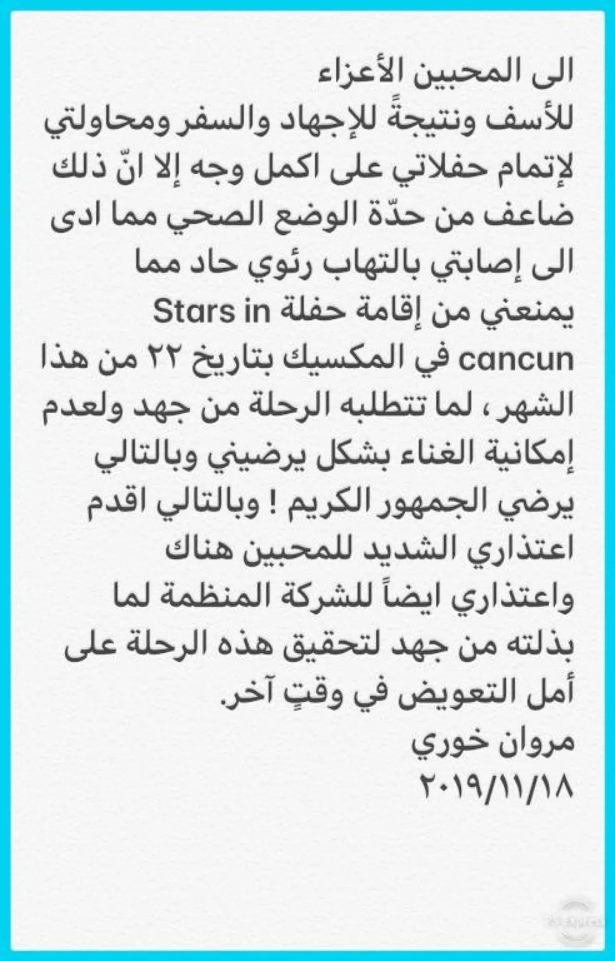 وكان مروان خوري قد اعتذر الأسبوع الماضي عن جلسة خاصة كان من المقرّر أنّ تجمعه بجمهوره في سلطنة عمان لأسبابٍ قال إنّها صحيّة، واكتفى بإحياء حفلتين في دار الأوبرا السلطانية، ما أزّم وضعه الصحّي فاضطرّ إلى إلغاء حفل المكسيك.
