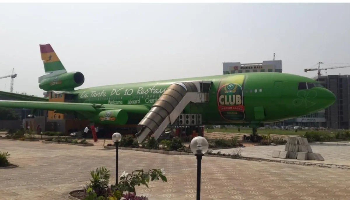 علينا أن نبحر عبر المحيط الأطلسي كاملاً، حتى نصل إلى القارة الأفريقية السمراء، وتحديداً إلى العاصمة الغينية أكرا، لنتناول وجبة عشاء أو غداء في مطعم لاتانتي دي سي10 La Tante DC10، الذي أقيم داخل الطائرة المفقودة الشهيرة دي سي-10 DC-10 التابعة لشركة الطيران الإفريقية غانا إيرويز. والذي يتسع لقرابة الـ120 شخصاً، مع قائمة طعام مميزة للغاية تضمن لكم تجربة مذهلة.