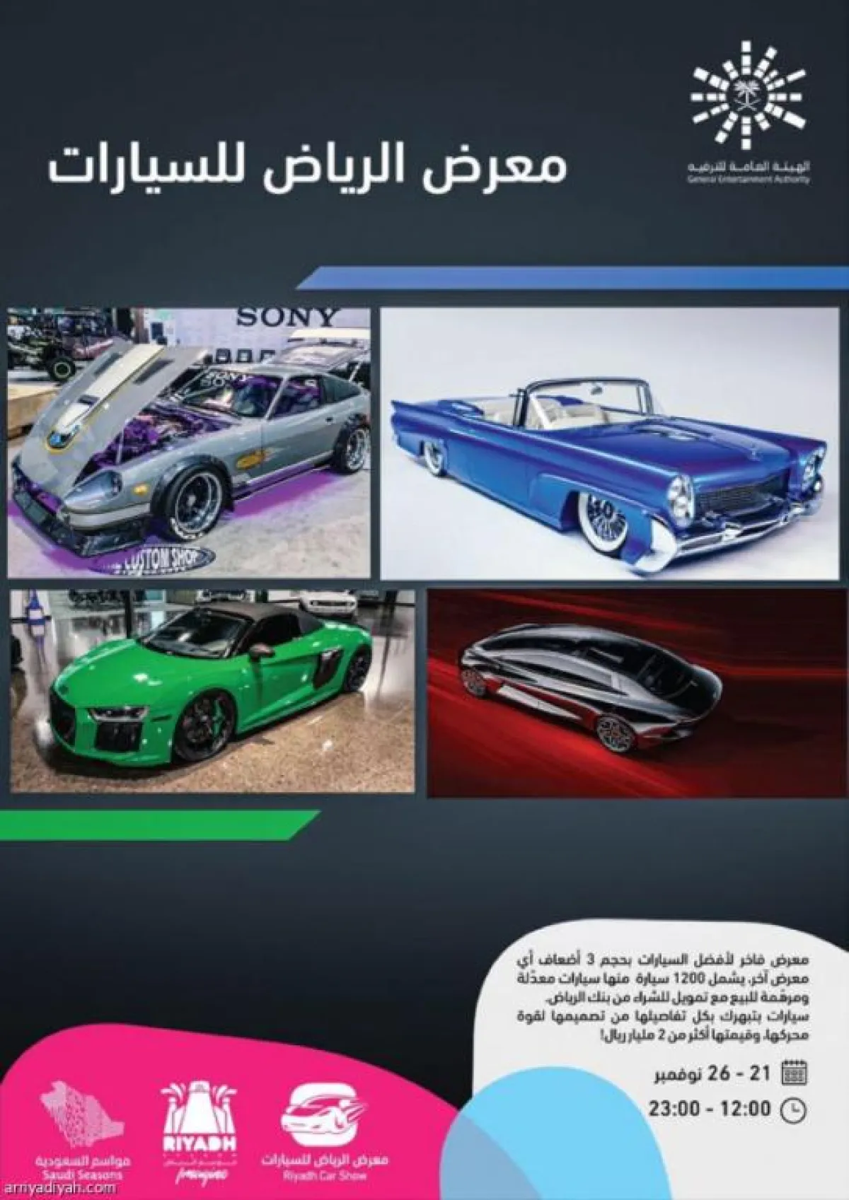 سيستمتع الزوار بعرض مونستر جام، وأندر السيارات الرياضية والكلاسيكية، وقطع التعديل النادرة، والسيارات المعدَّلة، حيث تتضمن الفعاليات أضخم المزادات على أفضل السيارات في العالم، التي يزيد عددها عن 1200 سيارة متنوعة، كلاسيكية وحديثة وفارهة قادمة من المستقبل، إضافة إلى سيارة تبلغ قيمتها 50 مليون ريال.