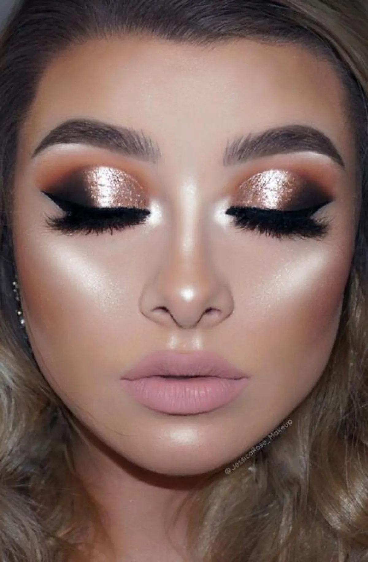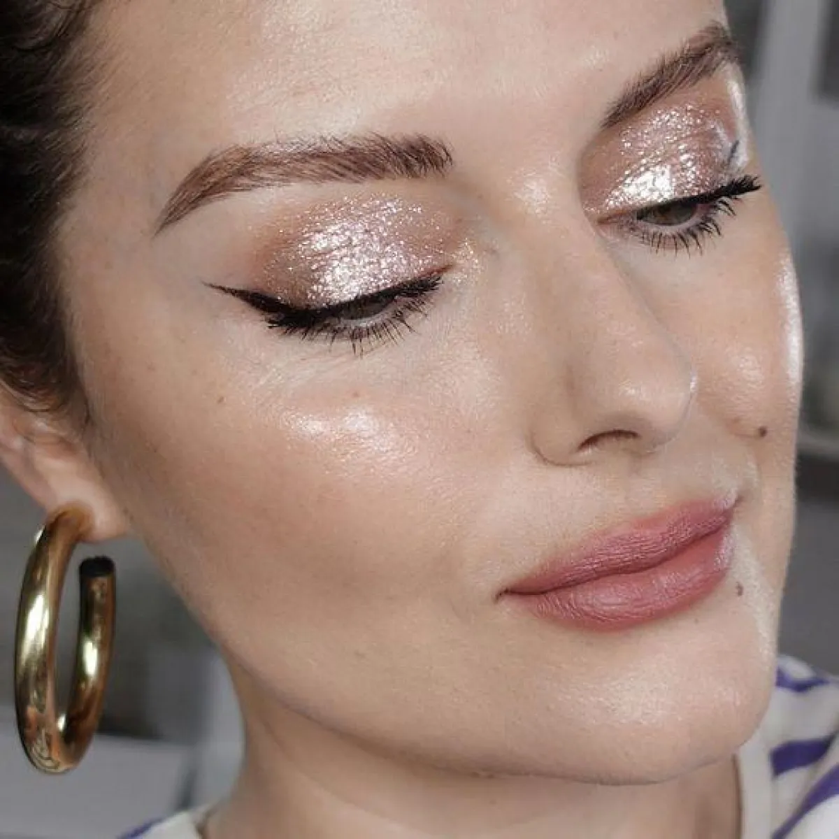 إذا كنتِ تبحثين عن مكياج رقيق وهادىء، وبالوقت نفسه ترغبين بتجربة لمسات الغليتر لمكياج العيون، ولا تريدين شيئًا صاخبًا كثيرًا، فإليكِ ألوان النود اللامعة للمكياج الروز غولد مع أحمر الشفاه الروز الغلوس.