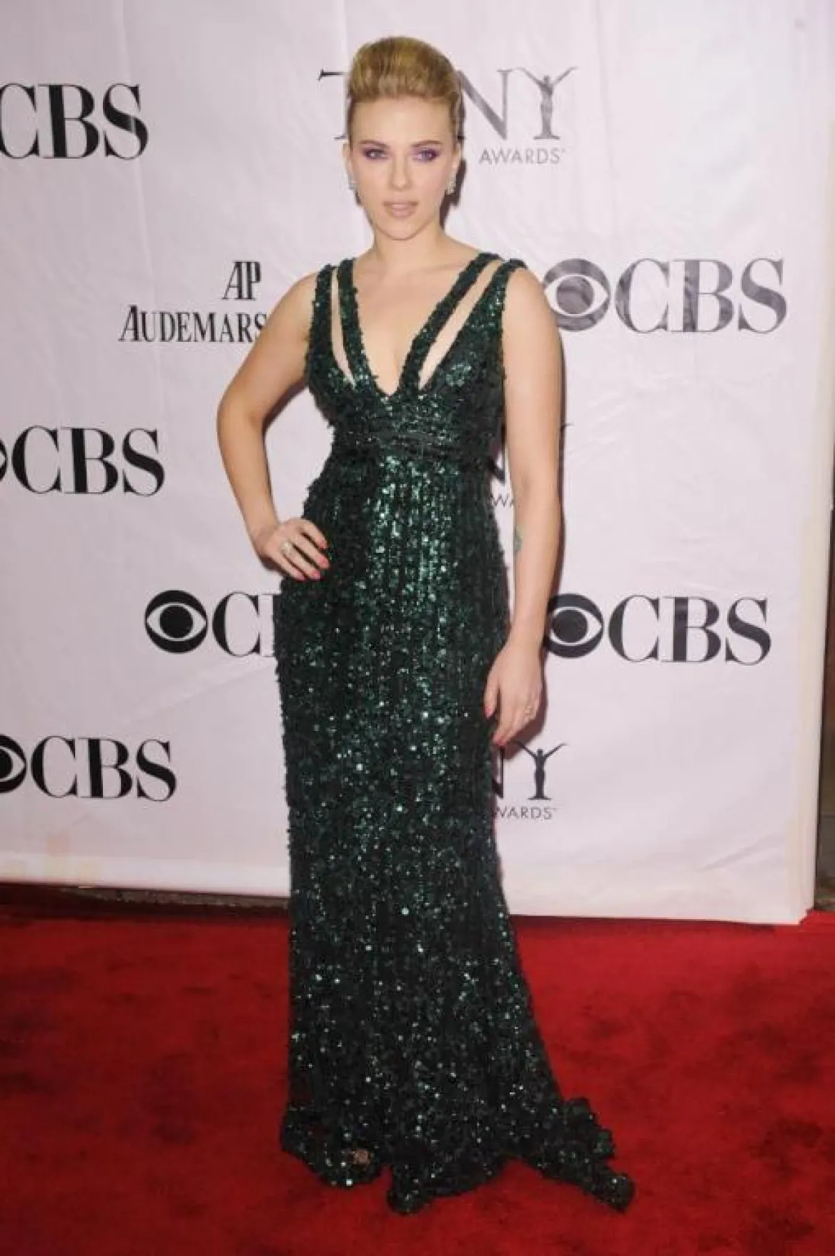 فستان باللون الزيتي من الترتر من ايلي صعب اختارته سكارليت جوهانسون في عام ٢٠١٠