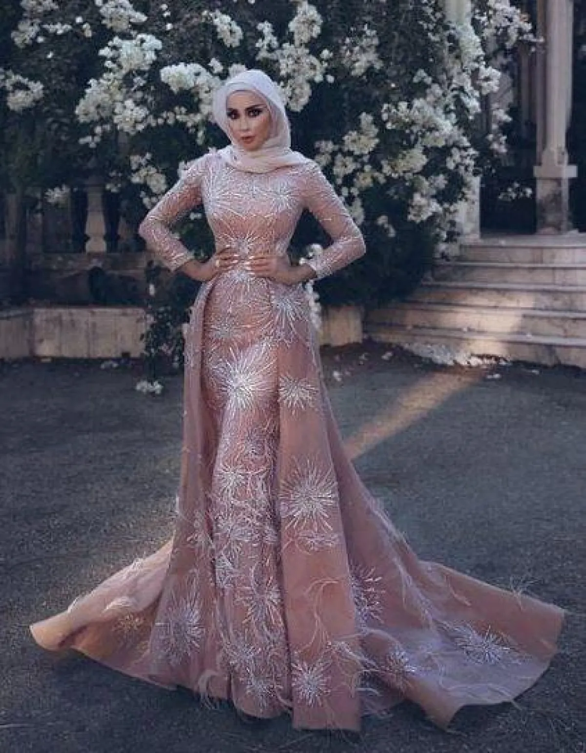 أما تطريزات الورود اللامعة فهي طريقتكِ لكي تعتمدي فستان خطوبة فخمًا وجذابًا، مثل الفستان السومون الروز مع تطريزات الورود الفضية، جذاب وناعم، نسقي معه حجابًا باللون نفسه لتحافظي على الطلة المخلمية.