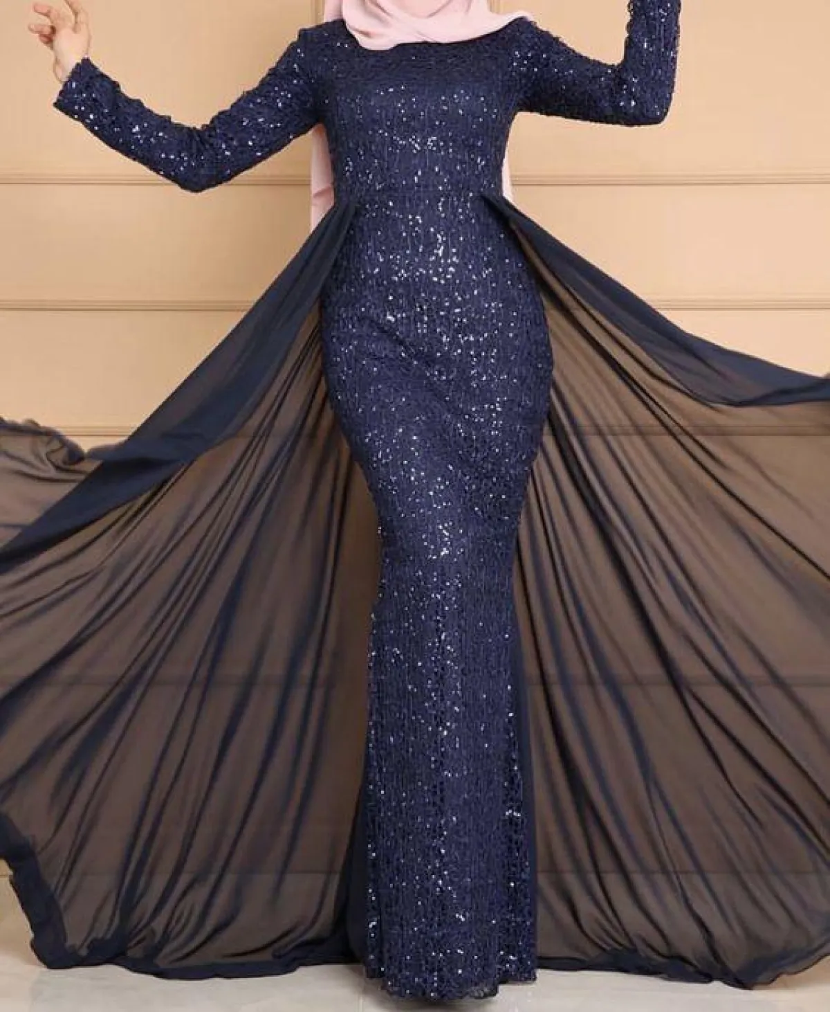 إن كنتِ لا تريدين تجربة صيحة الـ Open Front فجربي مثل هذا الفستان البراق من قماش الترتر باللون الكحلي، مع ذيل من الشيفون بألوان الفستان نفسه لاطلالة لافتة.