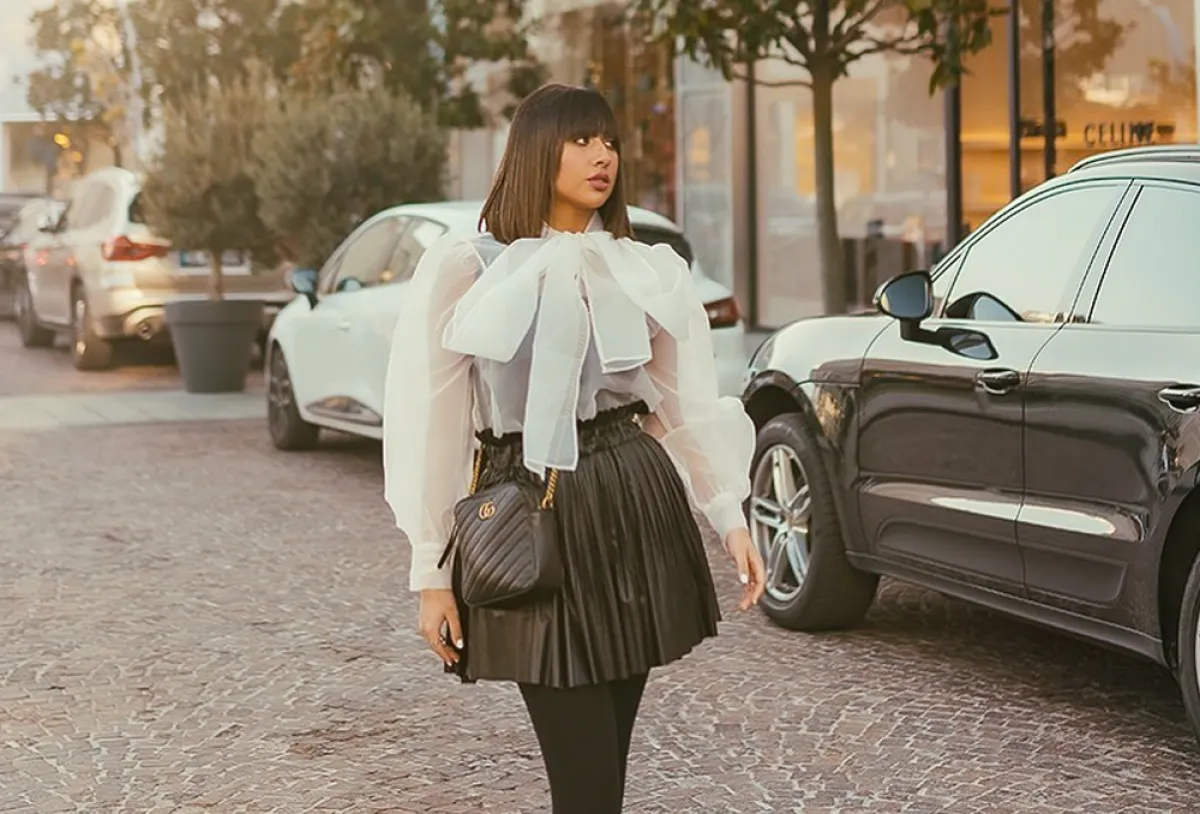 قبل موسم الشتاء، شاهدنا أشهر الفاشينيستا على انستقرام بتنورة مكسرة قصيرة، مثل فرح الهادي التي اختارت تنورة قصيرة من الجلد باللون الأسود الكلاسيكي، ونسقتها مع بلوزة بيضاء مزينة بأكمام منفوخة وصيحة رباط العنق البارز على شكل فيونكة دراماتيكية، ولأن فرح تميل إلى الملابس الحشمة المناسبة للمرأة الشرقية، لذلك اعتمدت زوج من الجوارب المصقولة مع بوت الكاحل العصري.