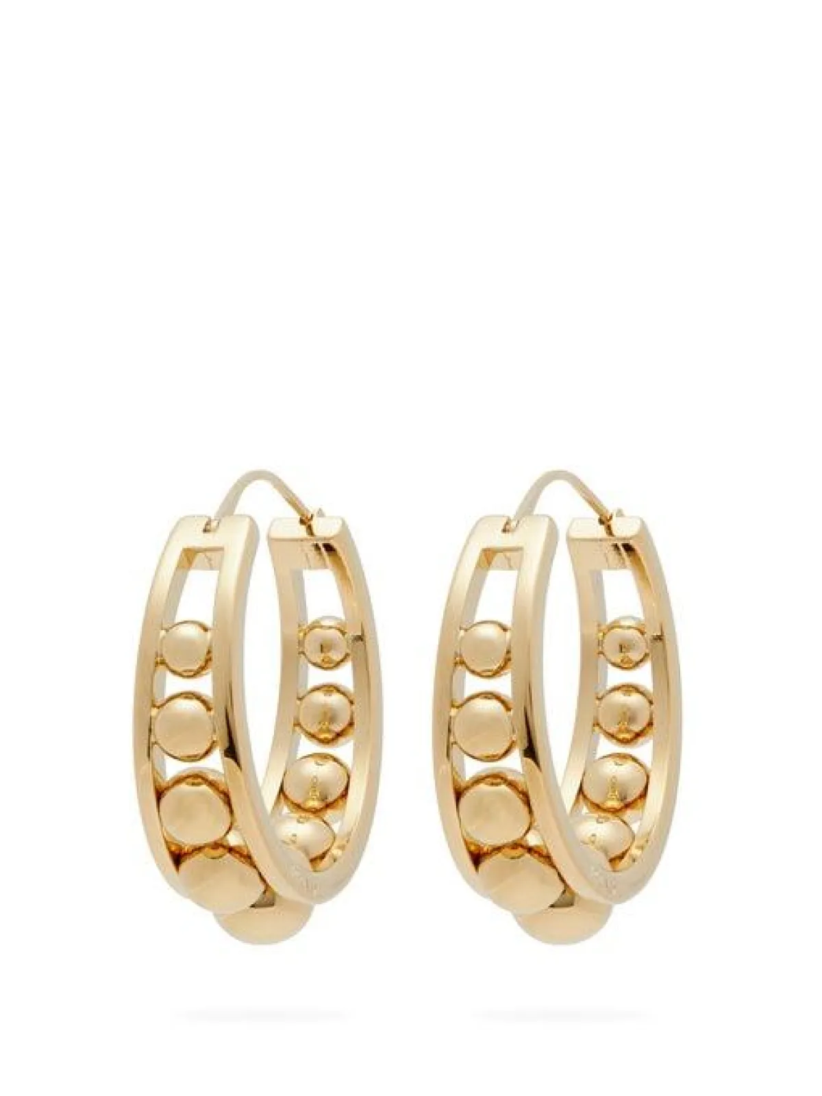 تصميم هذه الأقراط المميز من Prada هو ما لفت نظرنا بشدة إليها، فقد قدمت Prada هذه الأقراط بتصميم لافت وغير مألوف، جاءت على شكل حلقة مفرغة وفي داخلها كرات ذهبية اللون ومتفاوتة الأحجام لكي تمنحك إطلالة تجمع الكلاسيكية مع العصرية بأسلوب حديث ومتفرد.