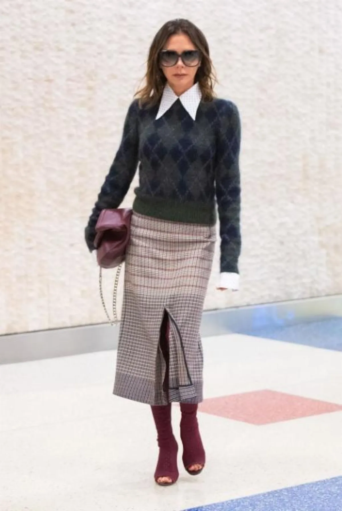 مؤخرًا شاهدنا فيكتوريا بيكهام Victoria Beckham وقد تألقت في اطلالة خريفية مميزة جمعت فيها بين الأناقة الكلاسيكية والعصرية، حيث اختارت تنورة ميدي باللون البيج نسقت معها بلوزة من الصوف بنقشة الكارو باللونين الزيتي والكحلي، ومن تحتها اختارت قميصًا بياقة كبيرة مستوحاة من السبعينيات، وقد أكملت الاطلالة بحذاء مطاطي وشنطة يد من الجلد باللون العنابي.
