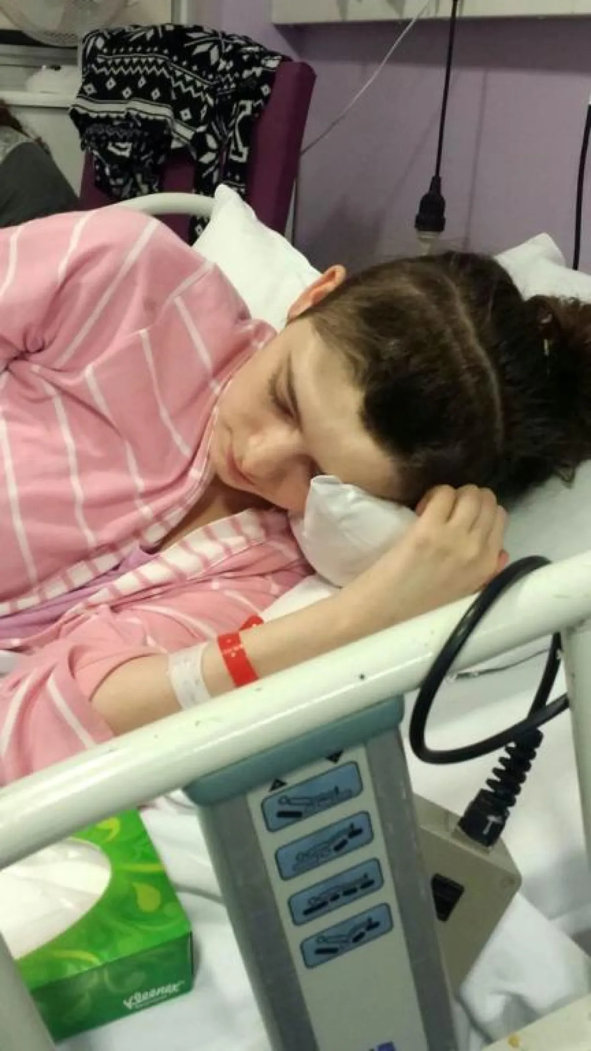 خضعت لعملية جراحية استمرت ست ساعات لإزالة جزء من جمجمتها بسبب تورم في المخ. ثم دخلت في غيبوبة لمدة 19 يوماً.