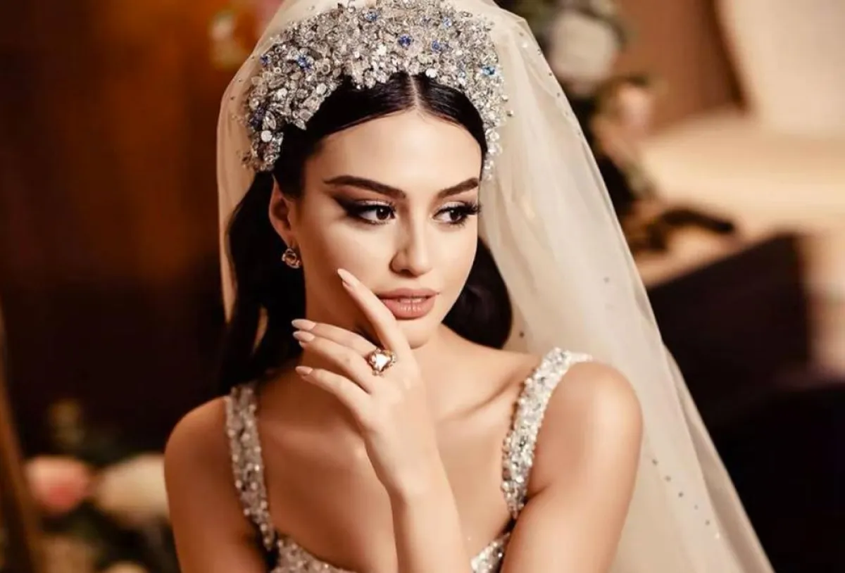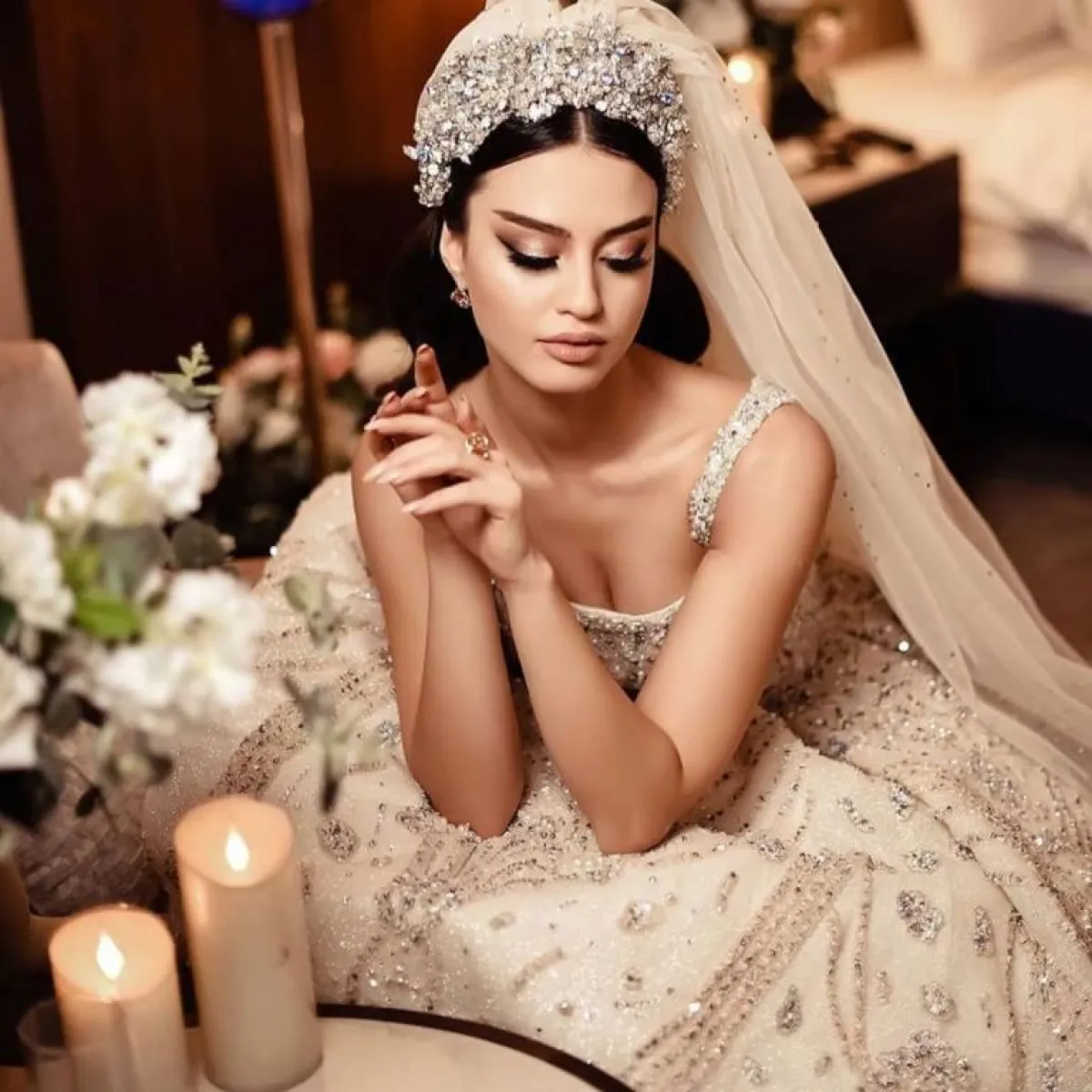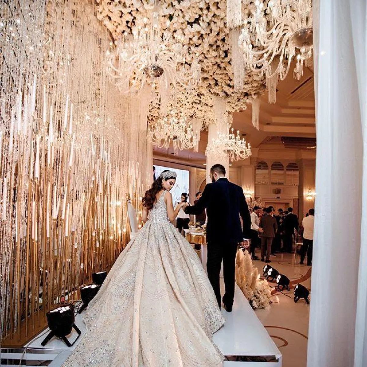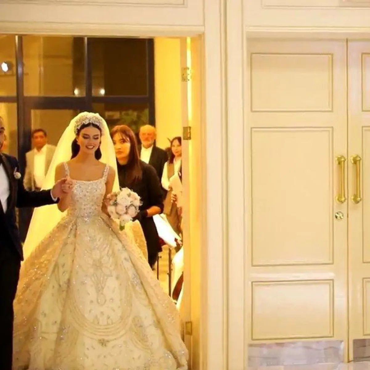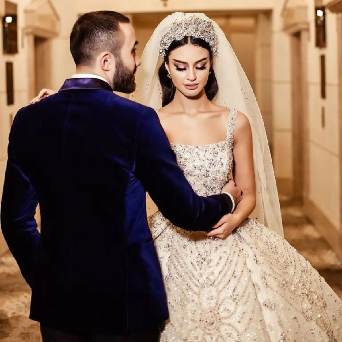 اختارت العروس مريم ناظم فستان زفاف مطرزًا بشكل فخم من تصميم الأوزبكية shadovi، وتميز بتصميمه الفخم والتنورة المنفوشة المزينة بتطريزات. وأكملت العروس اطلالتها بتسريحة ناعمة، مع اكسسوار زين مقدمة تسريحتها، أما المكياج فأبرز جمال العروس الذي يجمع بين الملامح العربية والروسية. أما زينة الزفاف فقد تميزت بألوانها الذهبية والديكور الفخم، والورود التي زينت طاولات الزفاف وكل زوايا صالة الفرح.