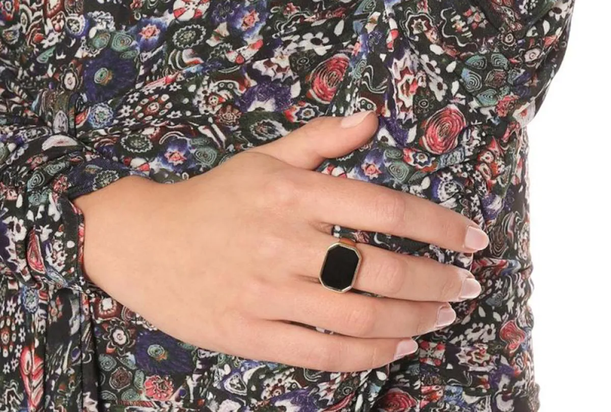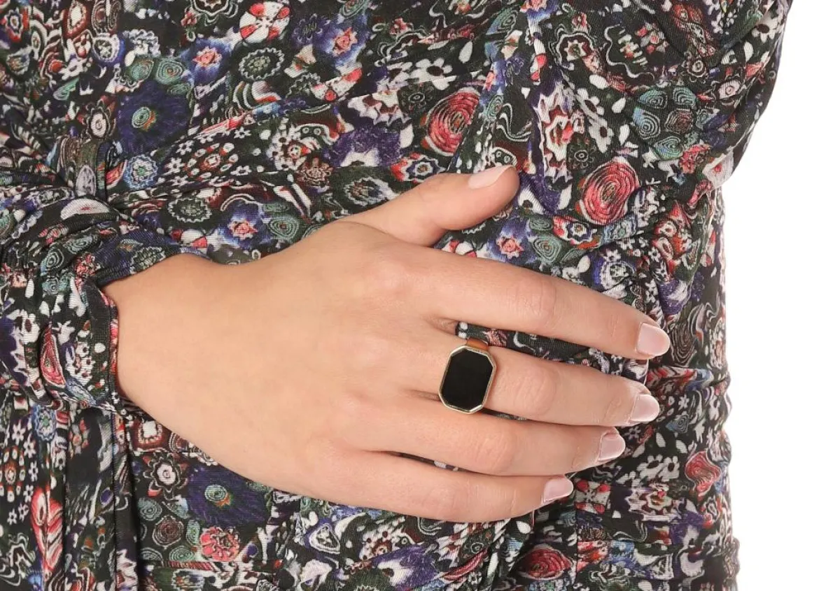 وقد استطاع هذا الخاتم المليء بالفخامة من أن يترك بصمته على الساحة بين الخواتم المرصعة بأحجار سوداء، خاصة وأنه رُصع بحجر كبير باللون الأسود من دون أي إضافات أخرى، ما يجعله مناسب لمختلف الإطلالات.