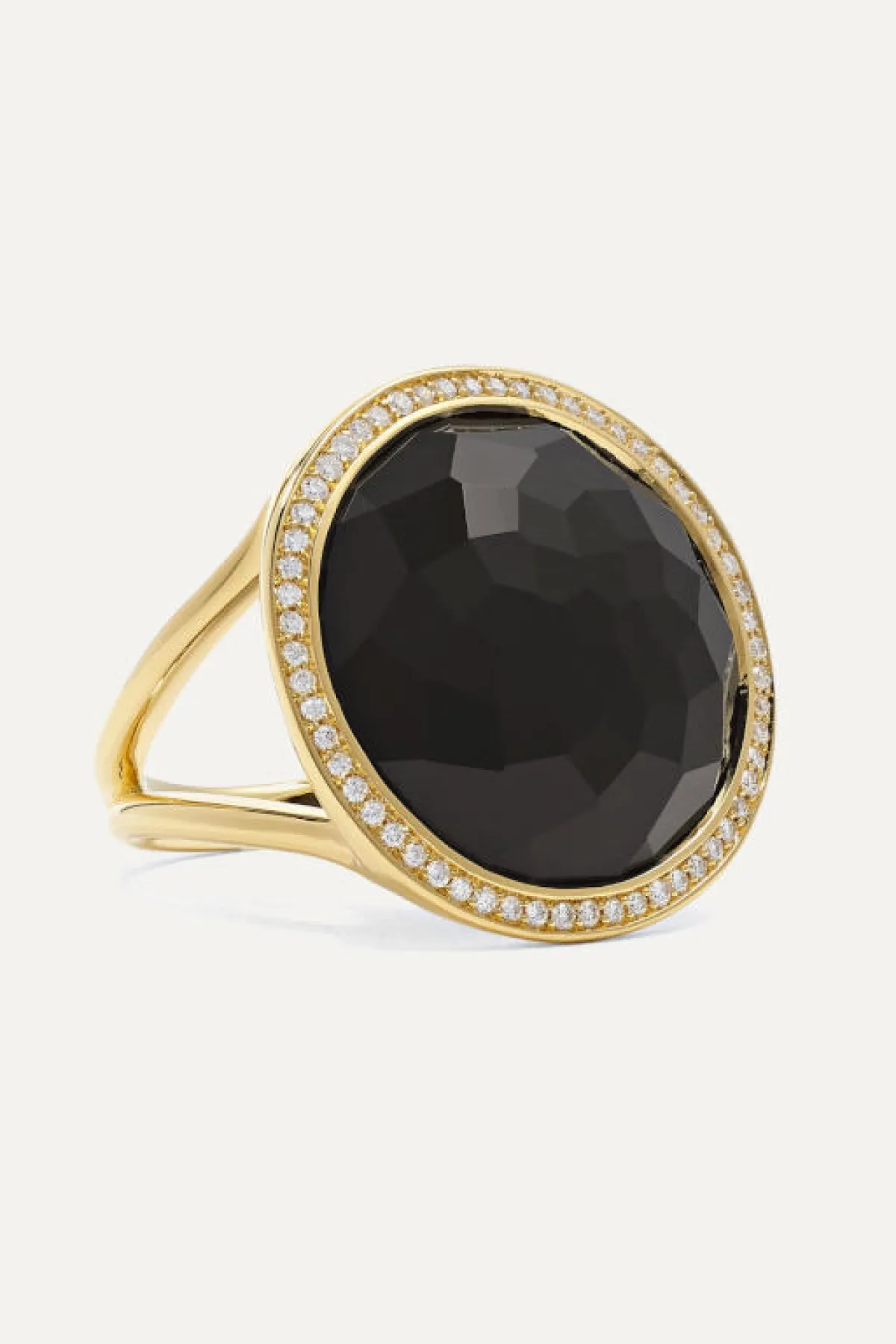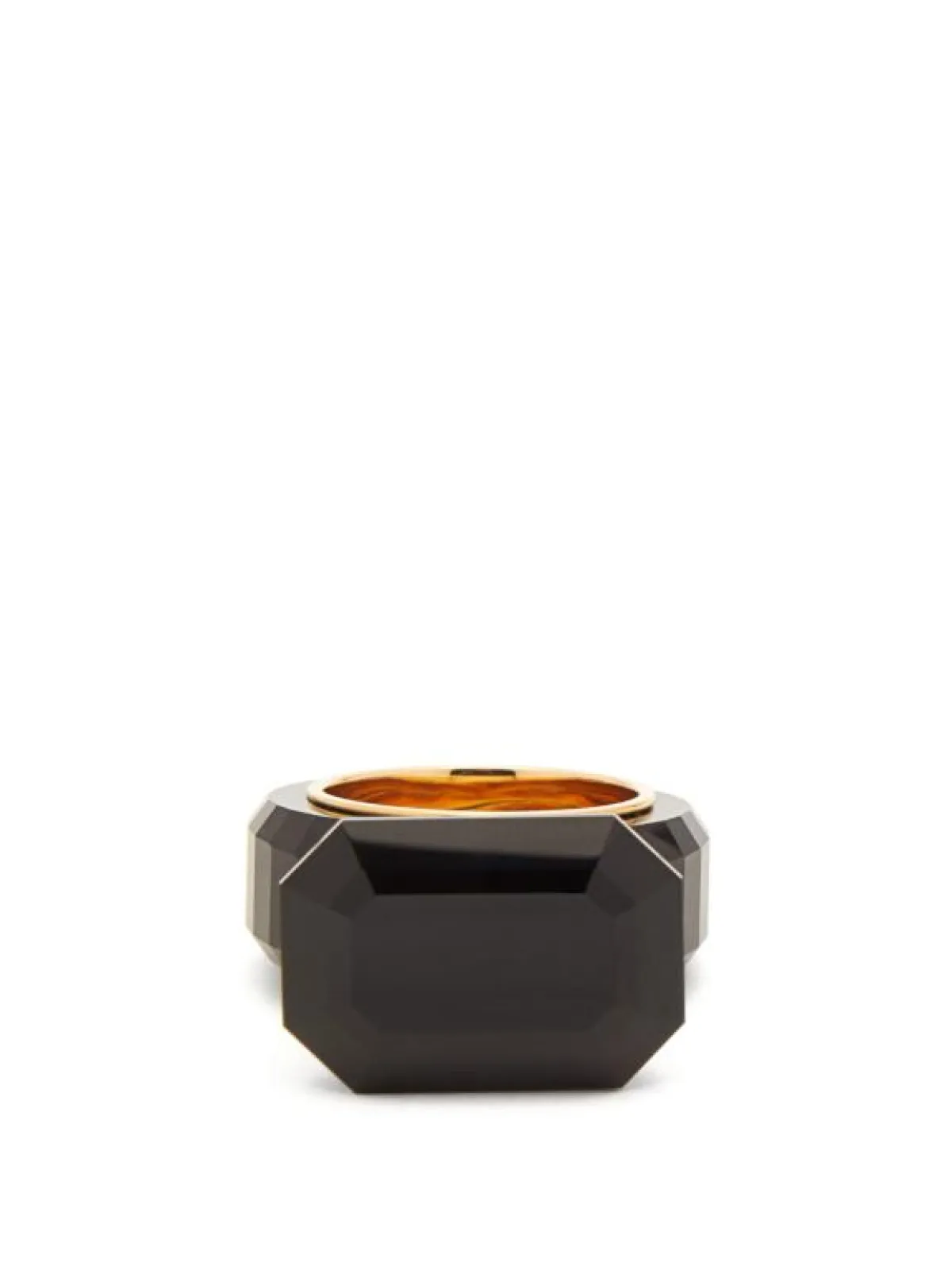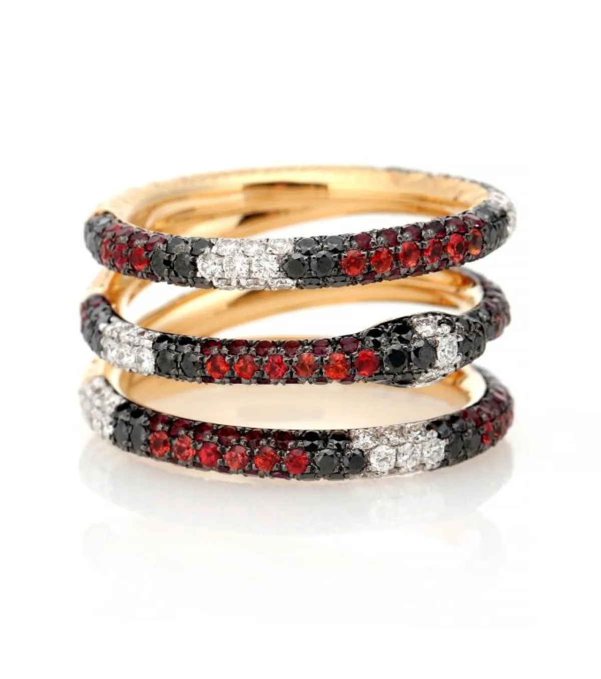 كعادتها تقدم دار Gucci كلّ ما هو غريب وغير مألوف في قطع المجوهرات، وحافظت على هذه الصفة مع هذا الخاتم ذو ثلاث طبقات متداخلة فيما بينها من الذهب الأصفر، في حين جاء مرصع بأحجار الألماس الصغيرة الحجم، والياقوت الأحمر وبالطبع أحجار سوداء صغيرة استطاعت أن تمنح الخاتم الأناقة المطلوبة.