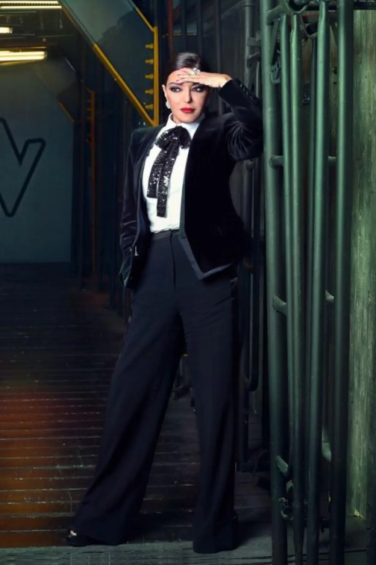 أما سميرة سعيد فقد تألقت في اطلالة ذات طابع ذكوري عصري من روبيرتو كافالي Roberto Cavalli، وكانت عبارة عن بدلة رسمية باللون الأسود عبارة عن بنطلون أسود بقصة أرجل واسعة، مع جاكيت بليزر من المخمل، ومن تحته قميص أبيض زُينت ياقته بربطة عنق من الترتر الأسود، وأكملت اللوك بمجوهرات ماسية فاخرة.