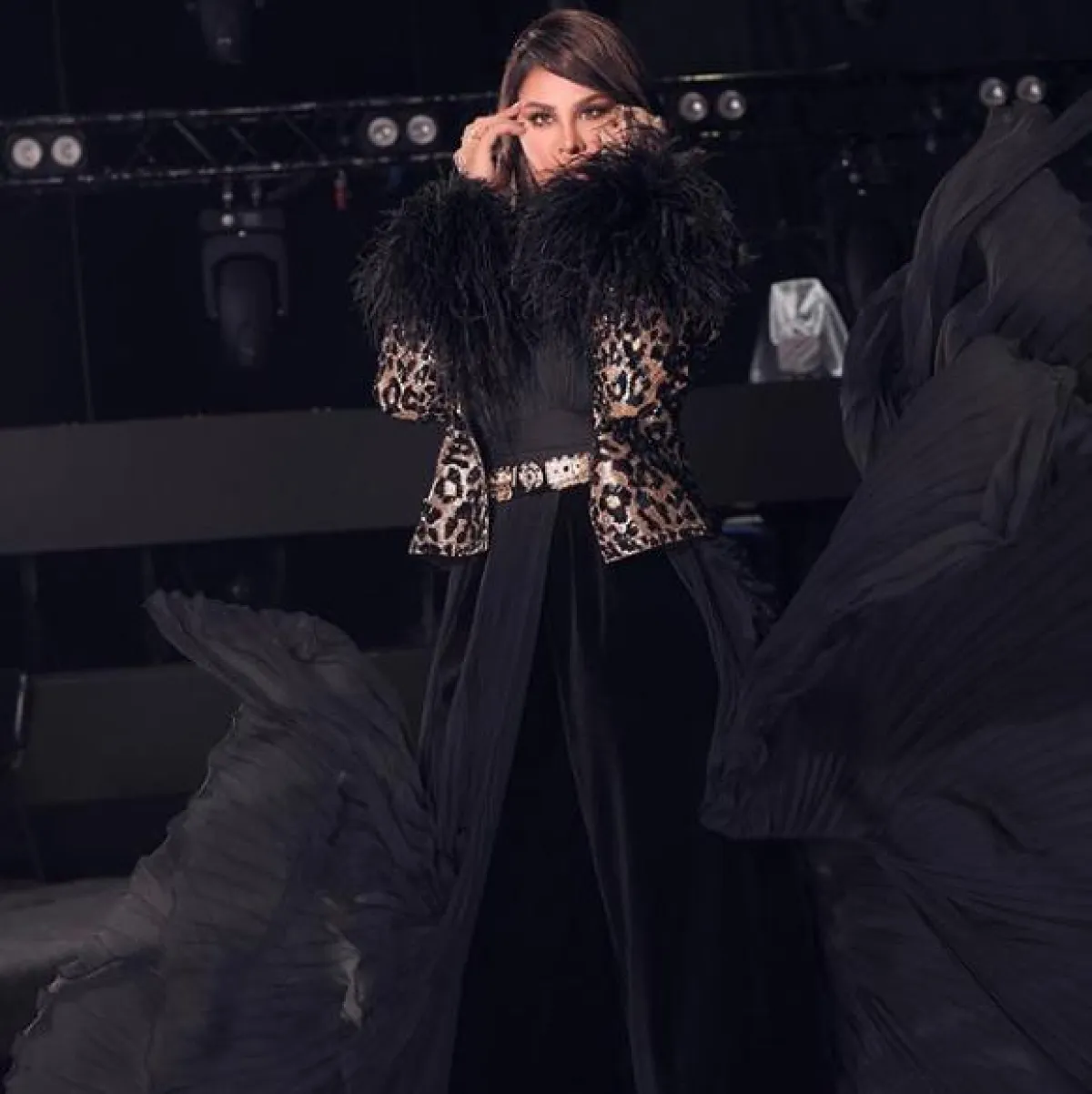 نسقت أحلام اطلالة لافتة من زهير مراد Zuhair Murad كانت عبارة عن بنطلون أسود بخصر عالٍ من المخمل، مزين بحزام معدني مع توب من قماش الشيفون الأسود بتصميم غريب، ومن فوقها جاكيت قصير بنقشة النمر باللونين الذهبي والأسود، أطراف أكمامه مزينة بالريش الأسود.