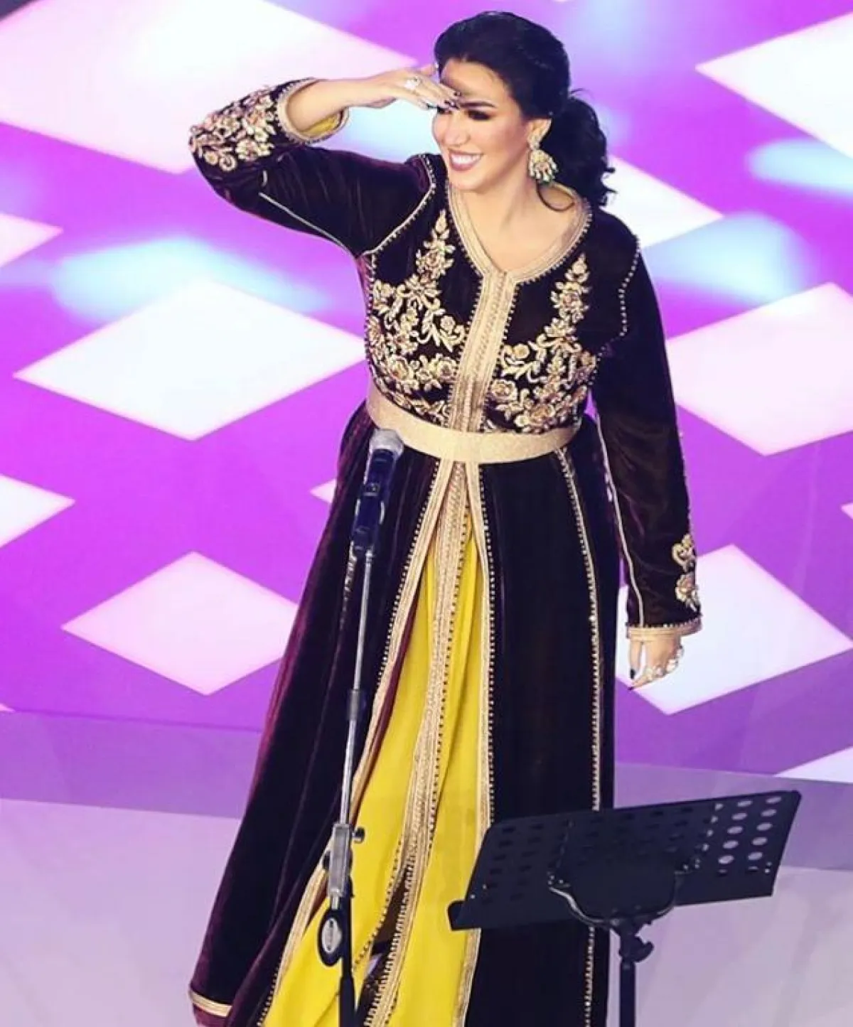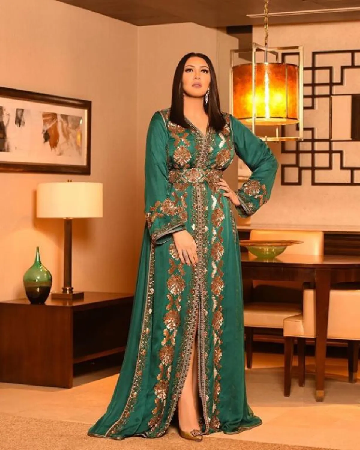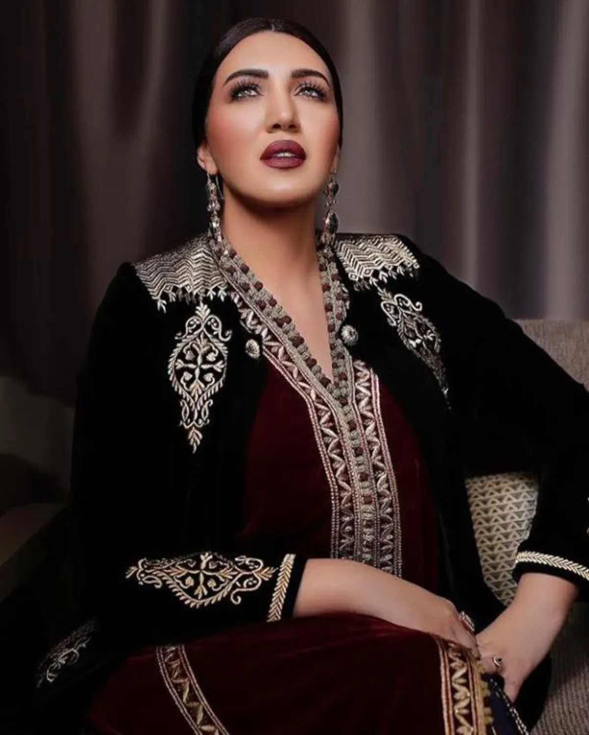 اعتمدت أسماء المنور على قفطان مخملي فيلفت مناسب أيضاَ لموسم الشتاء، مع تطريزات ذهبية بالخيوط اللامعة، وتطريزات تبرز حزام الخصر العريض للمسة أكثر رشاقة.