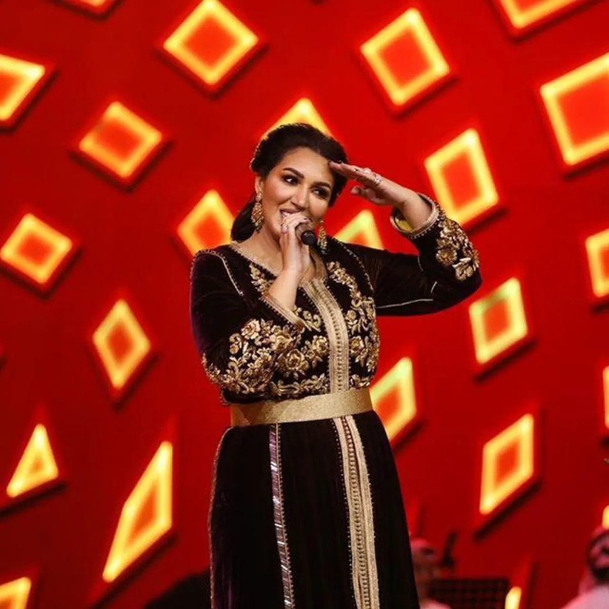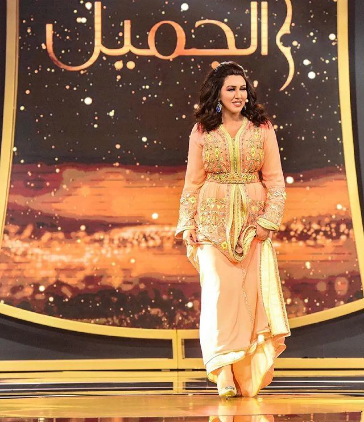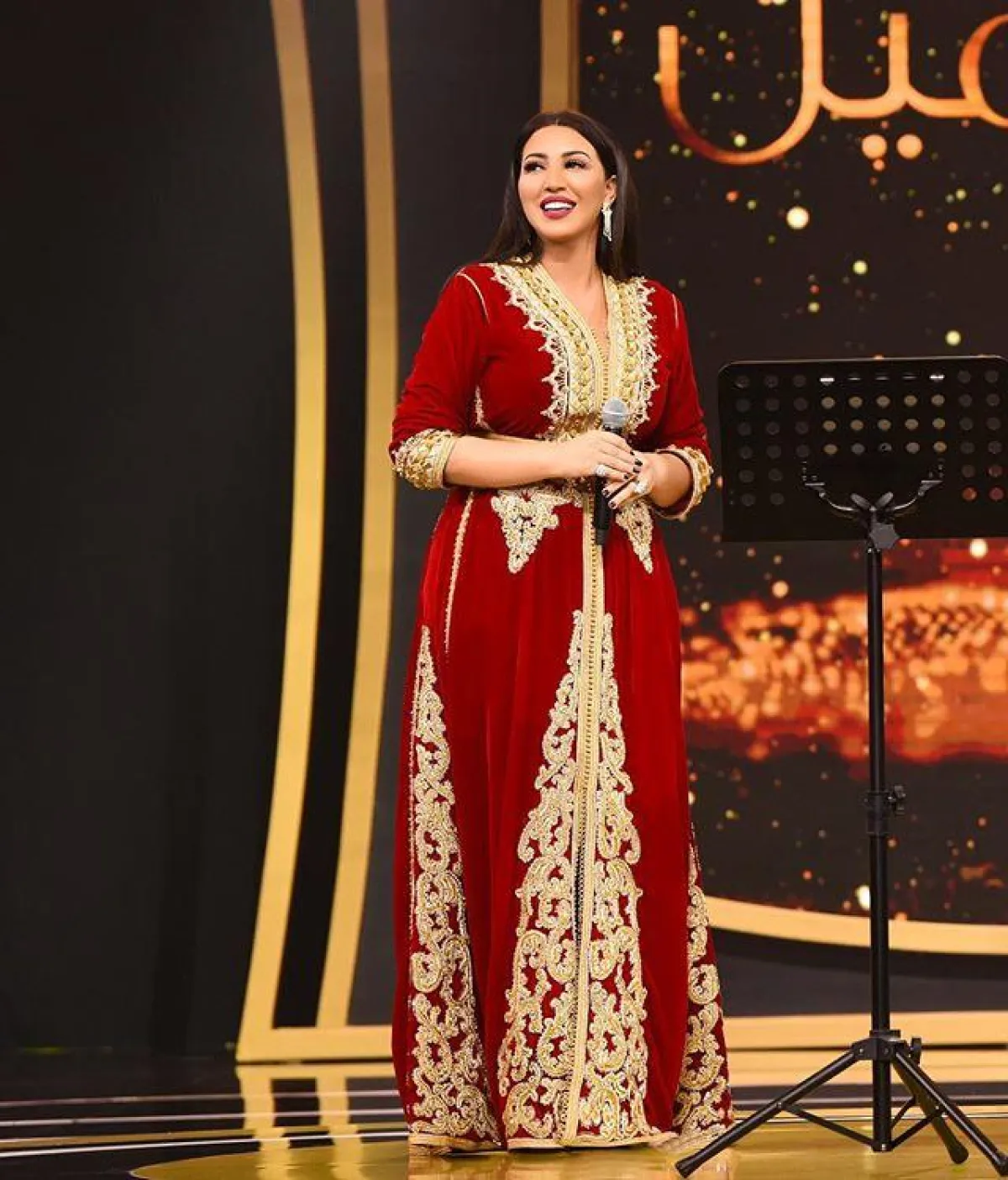 اعتمدت أسماء المنور على قفطان مخملي فيلفت مناسب أيضاَ لموسم الشتاء، مع تطريزات ذهبية بالخيوط اللامعة، وتطريزات تبرز حزام الخصر العريض للمسة أكثر رشاقة.