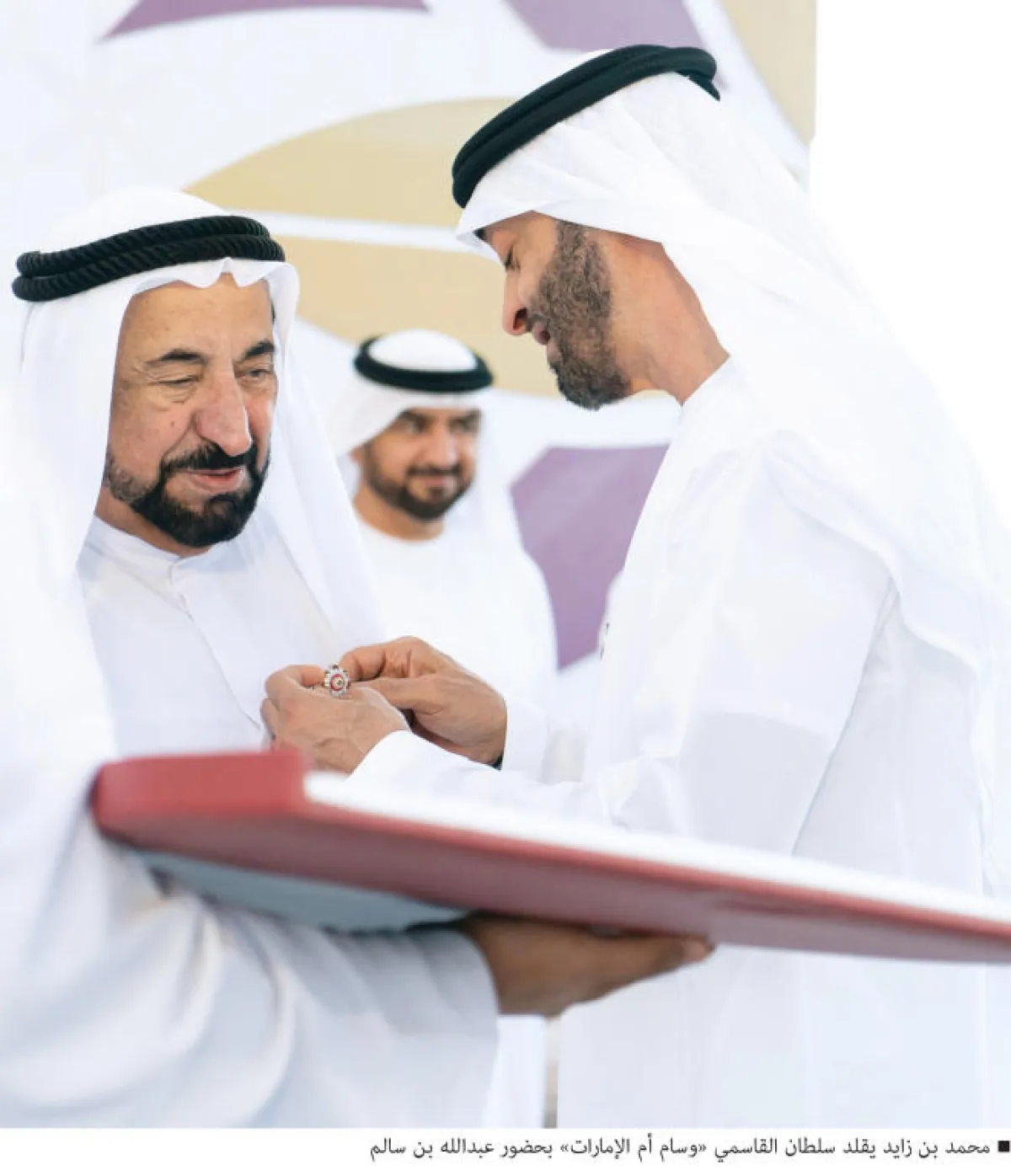 قلّد الشيخ محمد بن زايد آل نهيان، ولي عهد أبوظبي نائب القائد الأعلى للقوات المسلحة، الشيخ الدكتور سلطان بن محمد القاسمي، عضو المجلس الأعلى حاكم الشارقة «وسام أم الإمارات»، بمناسبة اختياره الشخصية الداعمة لقضايا المجتمع من قبل «برنامج سمو الشيخة فاطمة بنت مبارك للتميز والذكاء المجتمعي»، في دورته الخامسة.