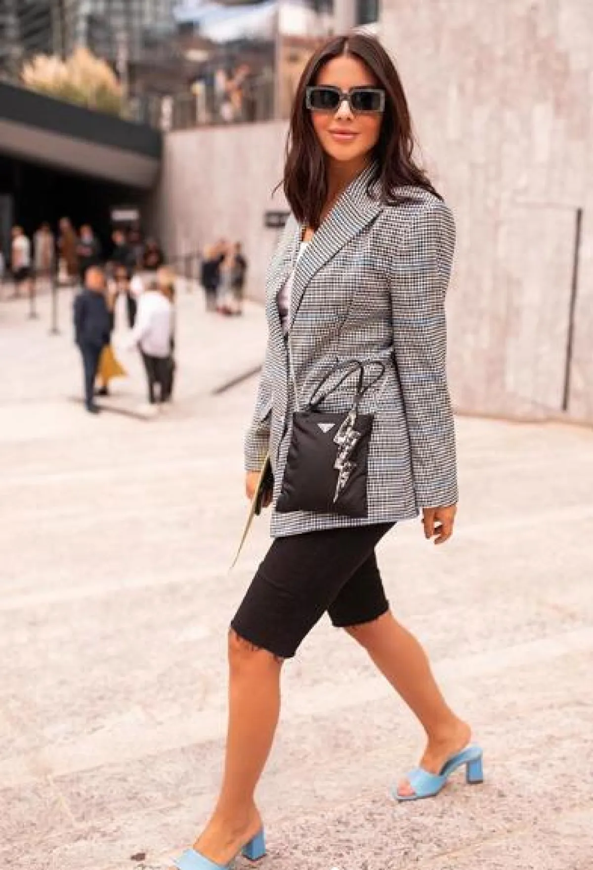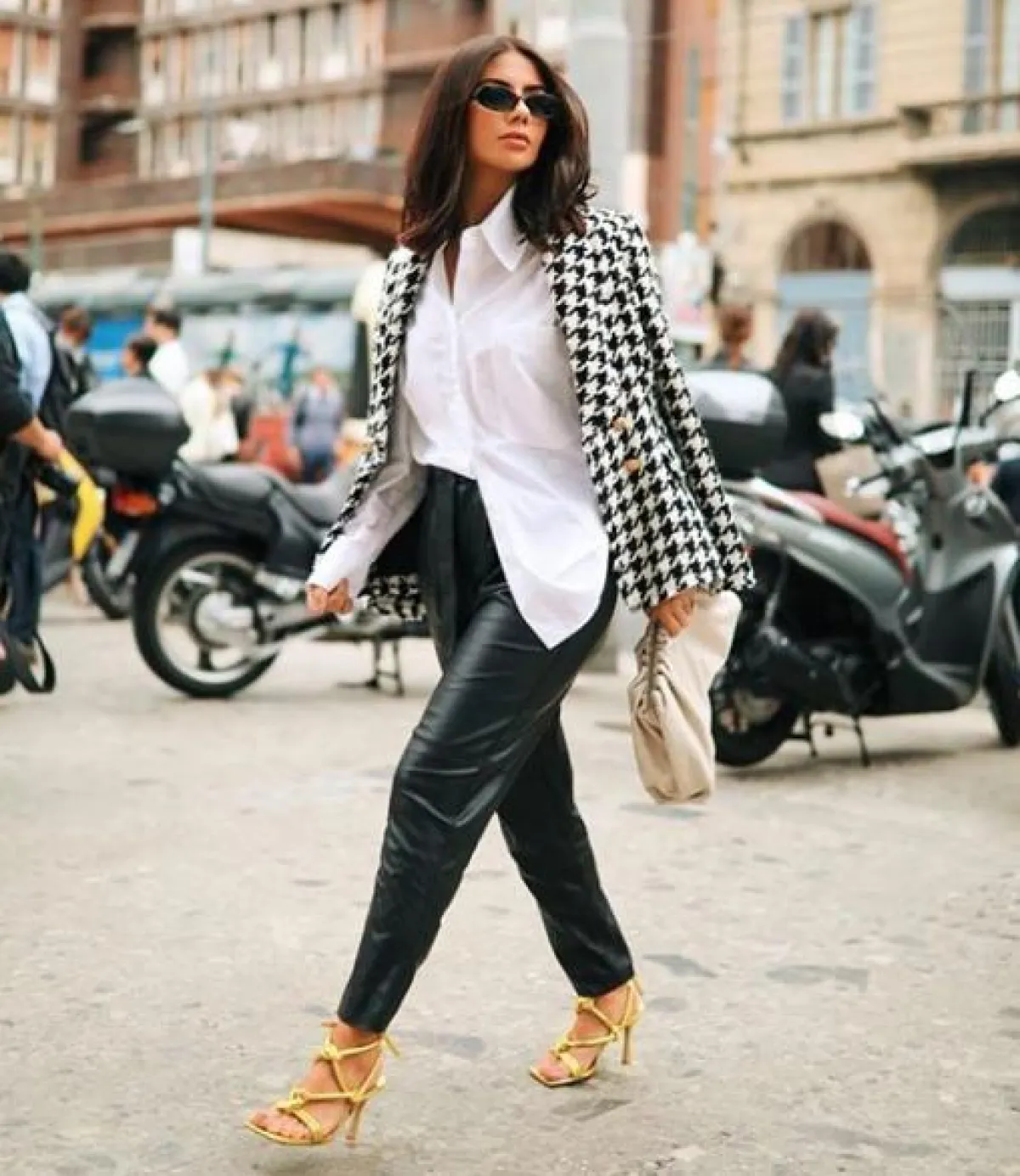 اعتمدت ديما الأسدي في هذا اللوك بليزر أنيقًا باللونين الأسود والأبيض، مزينًا بأزرار معدنية ذهبية، وقد نسقت من تحته قميصًا فضفاضًا أبيض وبنطلون جلد خصر عال باللون الأسود، وأكملت اللوك بشنطة يد باللون الأبيض السكري من بوتيغا فينيتا Bottega Veneta، وصندل بكعب عالٍ ذهبي، ونظارات شمسية بتصميم عصري.