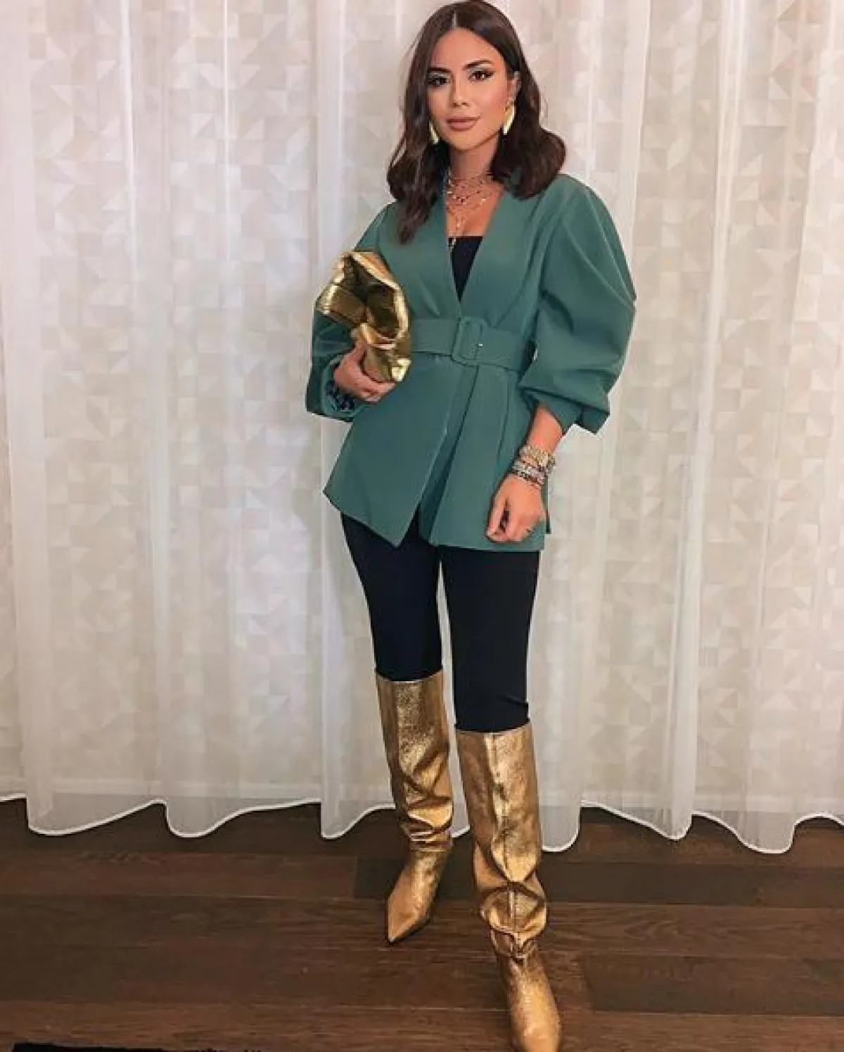لاطلالة مسائية جمعت بين الأناقة والعصرية، اختارت ديما الأسدي جاكيت بليزر باللون الزيتي الغني، قصته مميزة مع حزام على الخصر، وقد نسقت معه سروالًا مطاطيًّا باللون الأسود، وأكملت اللوك بشنطة يد وجزمة عالية باللون الذهبي الميتالك، والعديد من المجوهرات الناعمة التي أضافت من خلالها لمسات مميزة.