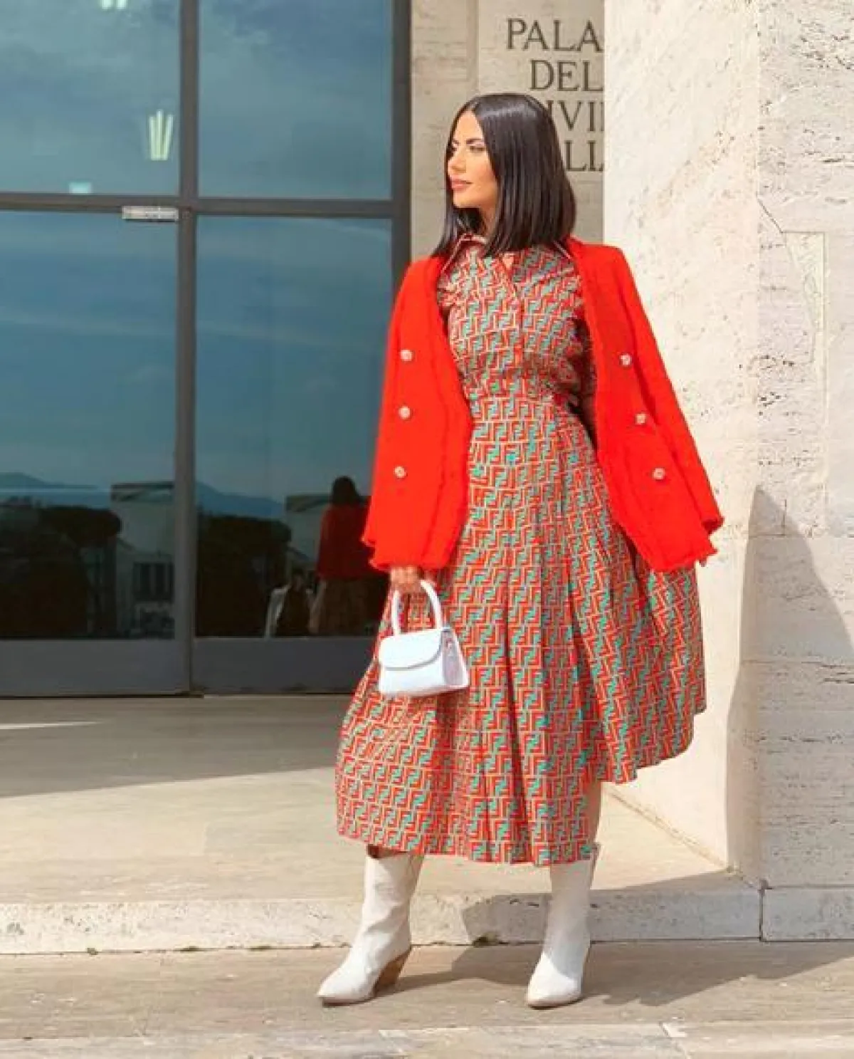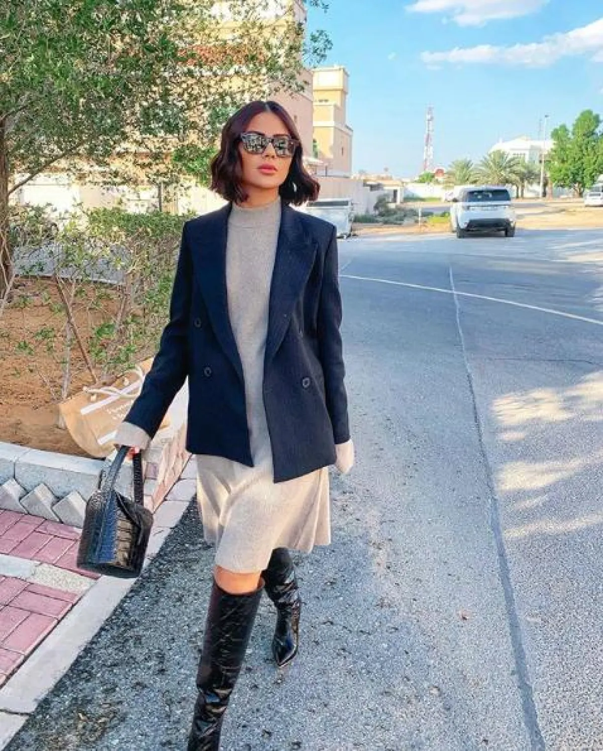 لوك خريفي أنيق نسقته ديما الأسدي وقد اعتمدت فيه الأسلوب الأنيق الكلاسيكي، حيث اختارت فستانًا بياقة عالية باللون الرمادي، ونسقت من فوقه جاكيت بليزر باللون الكحلي الداكن، وأكملت اللوك بشنطة يد مميزة من الجلد الأسود، وجزمة عالية بكعب منخفض، ونظارات شمسية باللون الأسود.