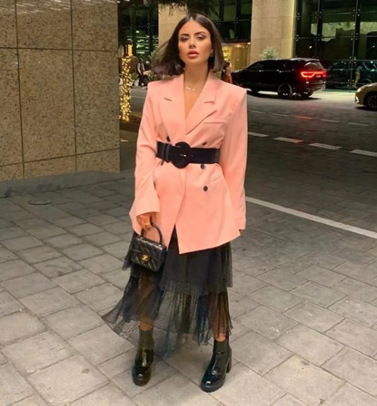 نسقت ديما الأسدي مؤخرًا لوك جمع بين الأناقة والعصرية في البليزر، الذي اختارته بقصة واسعة oversize باللون الزهري، وزينت خصره بحزم عريض أسود، واختارت معه تنورة ماكسي مصنوعة من طبقات من التول، وأكملت اللوك بحذاء كاحل وشنطة يد صغيرة من الجلد الأسود من شانيل Chanel.