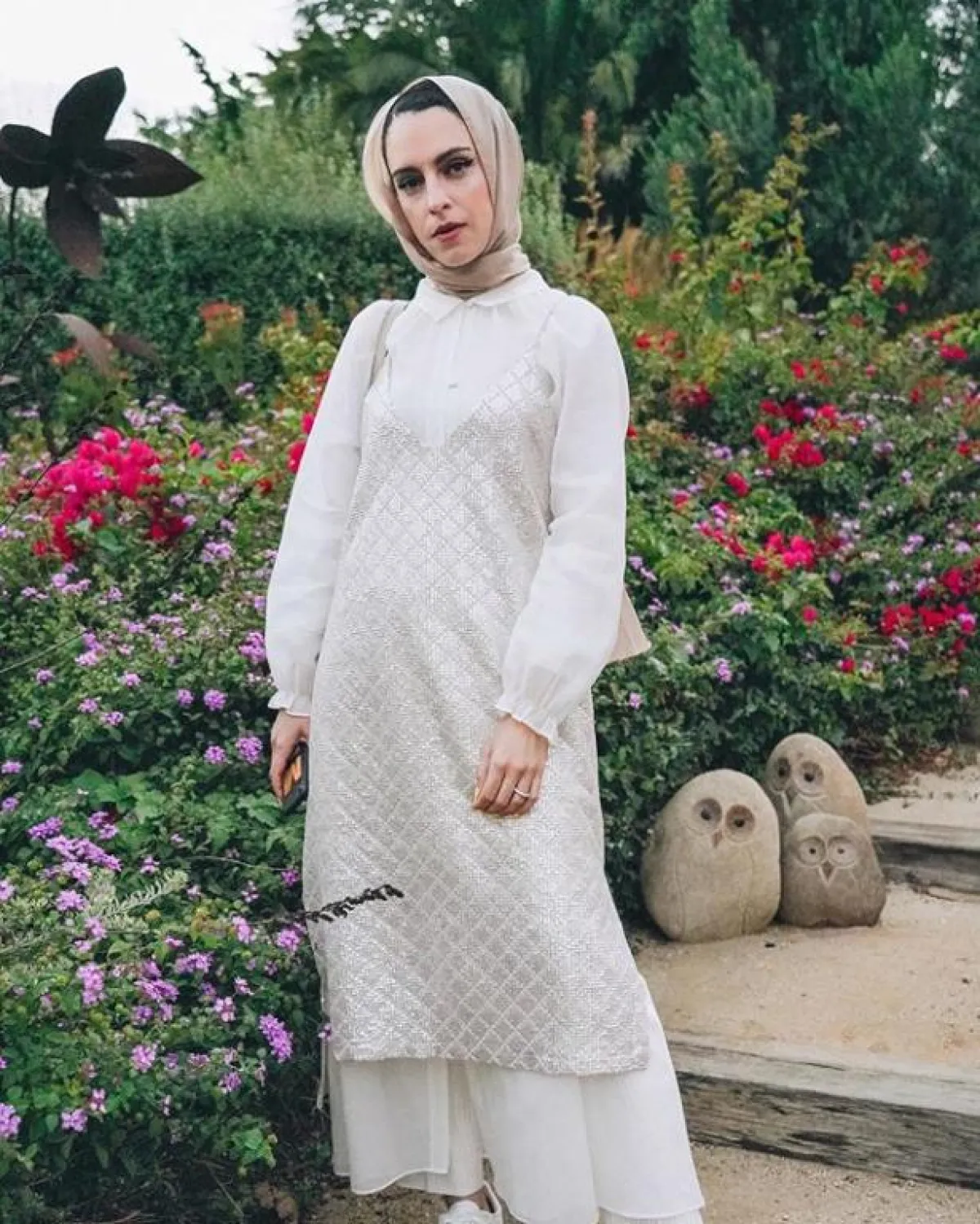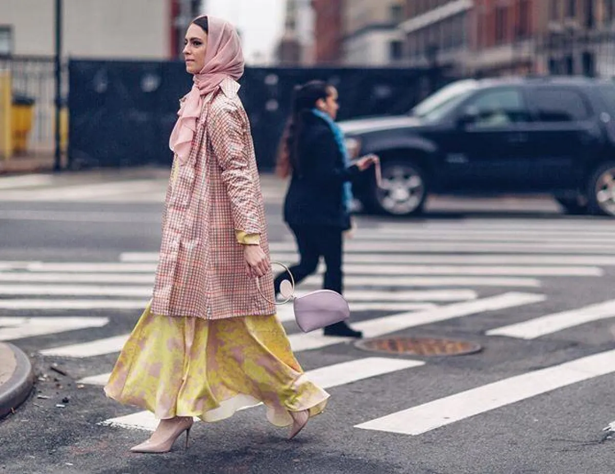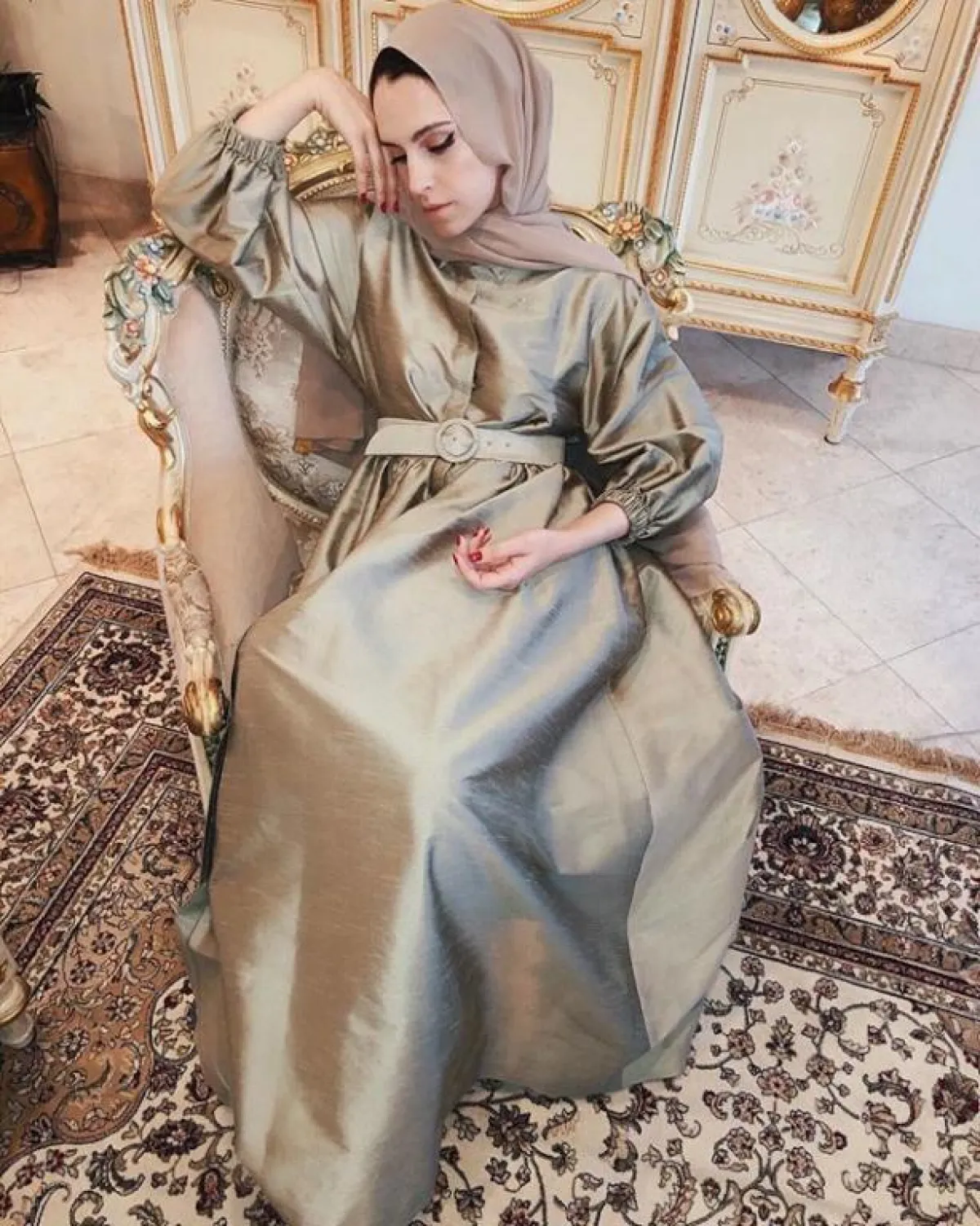 يمكنكِ اعتماد الفساتين الناعمة بخامة الساتان الحادة، كهذا الموديل من مادموزيل ميمي، مع حزام الخصر بلون الفستان نفسه الذي أضاف لمسة أنثوية لاطلالتها، نسقت معه حجابًا باللون النود البيج، لتحافظ على اللوك المحايد المخملي.