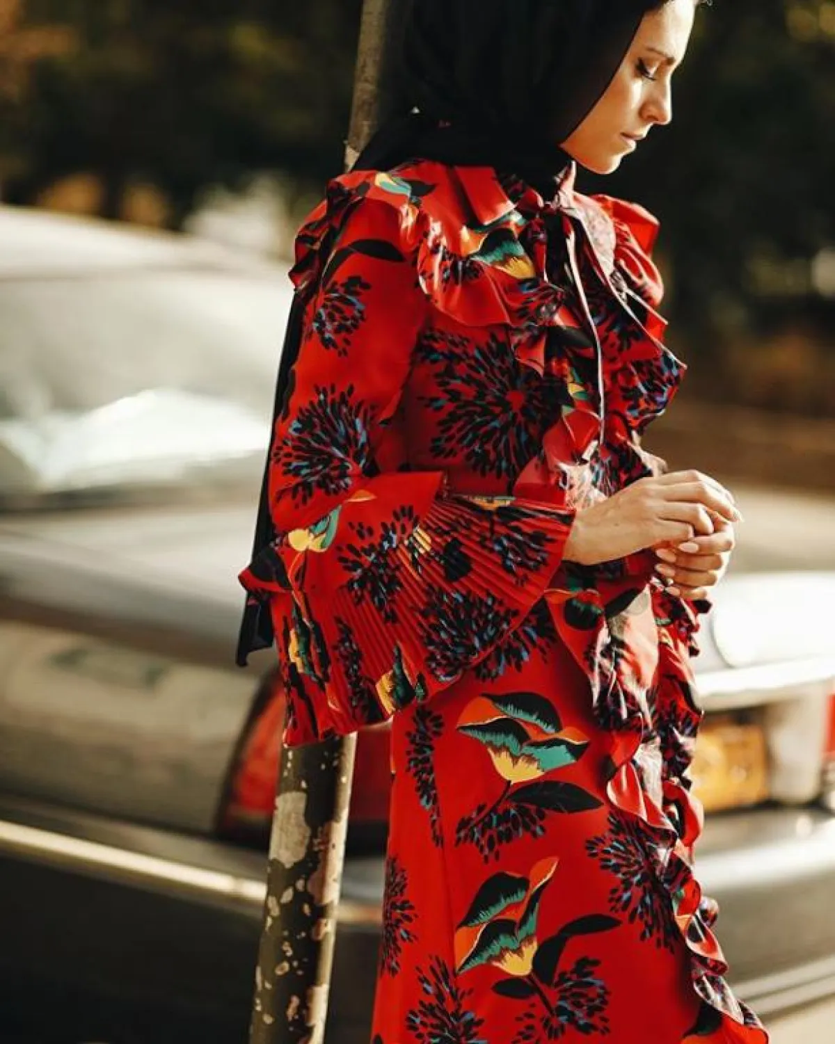 المعطف الكاروهات مع الفستان المطبع بالورود، لاطلالة مثالية من أزياء الشارع