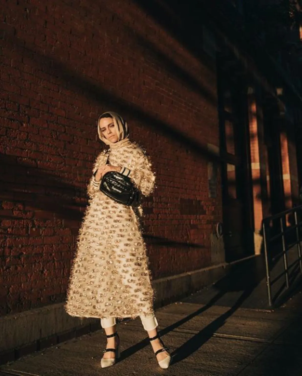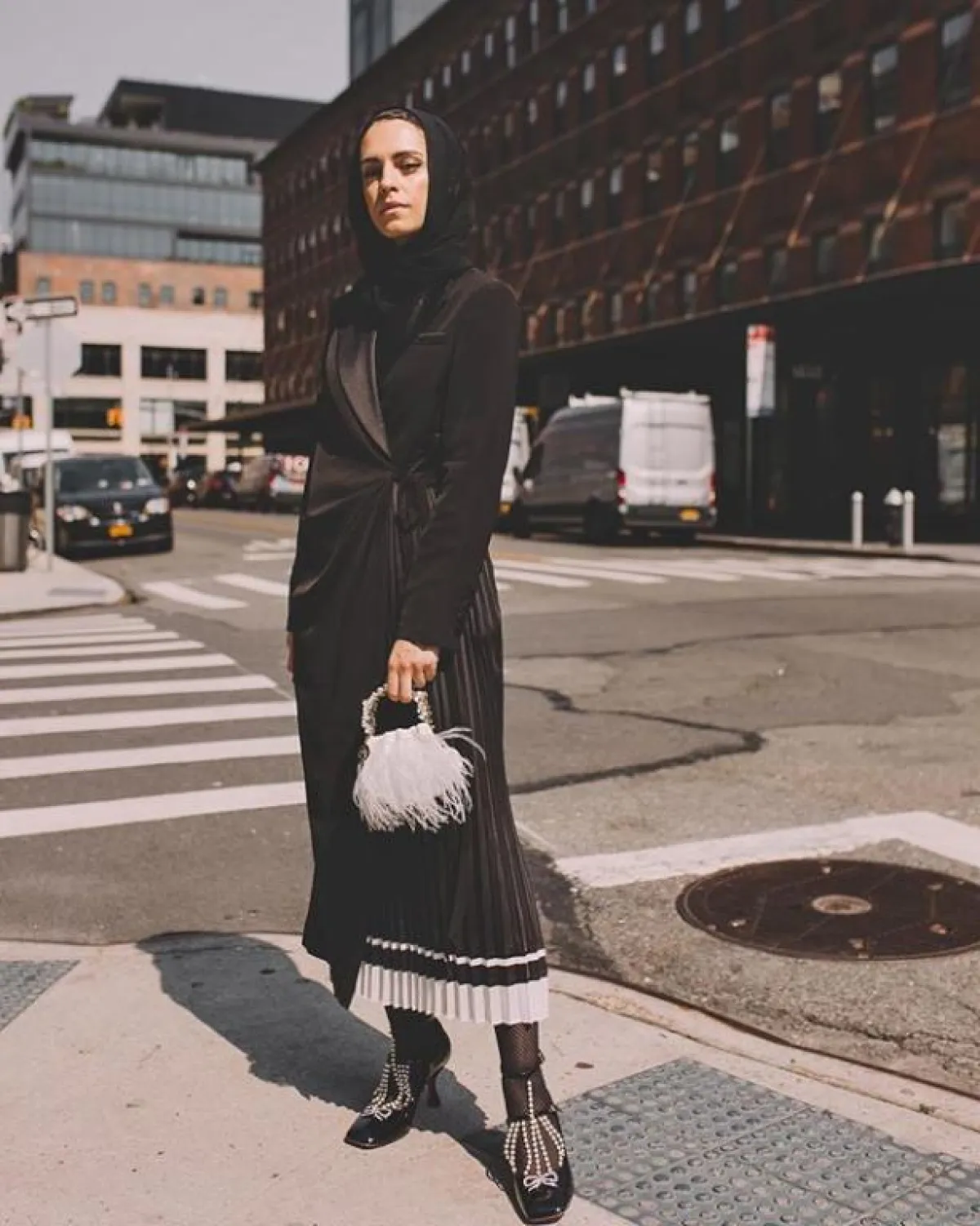 البدلة من القطع العصرية المميزة التي تفضلها الكثير من الفاشينيستات، اعتمدتها مادموزيل ميمي بطريقة أكثر أنثوية مع هذه الخامة الأشبه بالجاكار أيضًا، مع لمسة من تطريزات الريش المنفوشة على البدلة بالكامل.