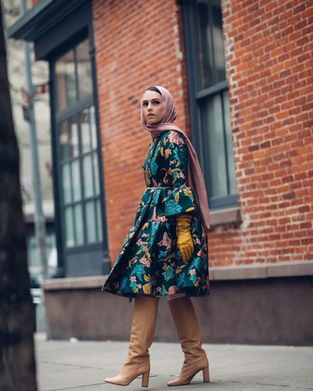 من الستايلات التي أعجبتنا كذلك من مادموزيل ميمي، هذا الستايل للبلوزة المعطف الملونة من خامة الجاكار، بألوان الورود الخردلية، مع حزام خصر رفيع، ولهذا قد اختارت بوت الساق الطويل باللون النود البيج، حتى تُبرز أكثر جمال المعطف.