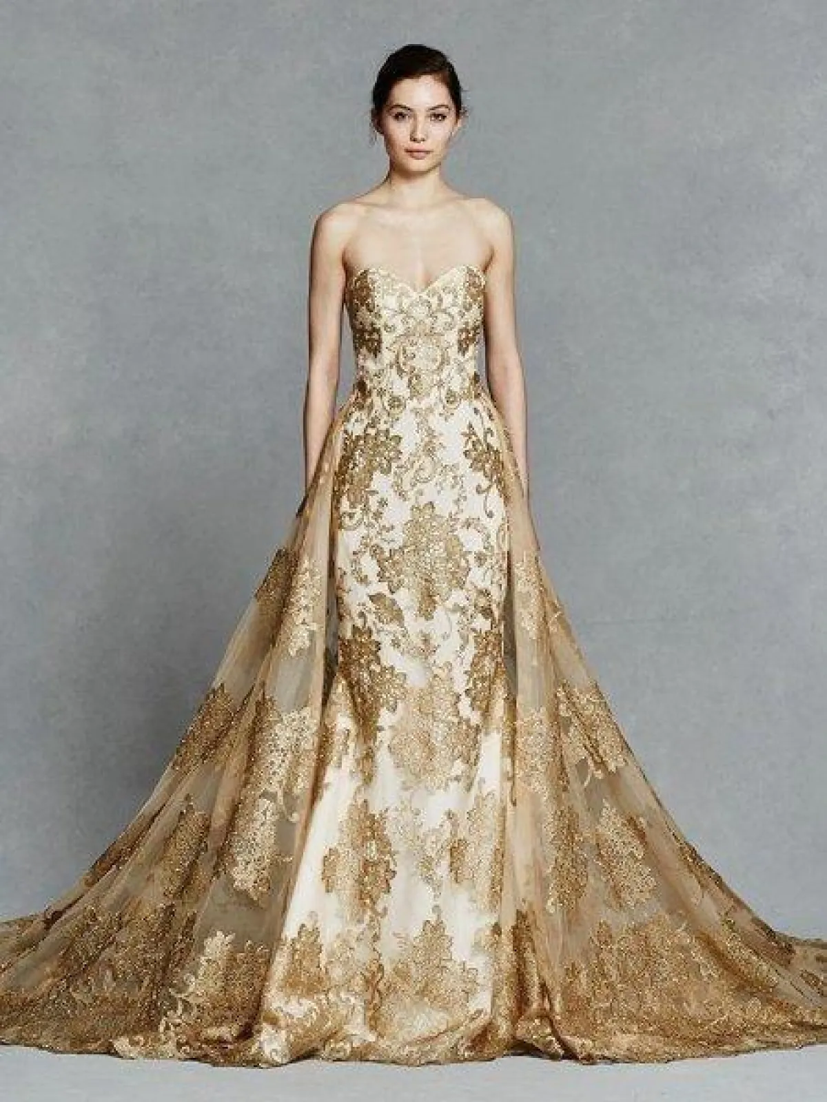 يكسر اللون الذهبي القاعدة المتعارف عليها في ثوب العروس، أو ثوب الخطوبة، ويُظهر المرأة سوبر أنيقة وجميلة. كما يتناغم الذهبي مع أجواء الرومانسية، التي تحيط بالمرأة من الإضاءة والألوان، ويعطي طلّة جميلة للفتاة. ويحتاج ارتداء فستان زفاف باللون الذهبي إلى جرأة كبيرة من العروس، التي ستحصل على اطلالة ملوكية، لا تشبه مثيلاتها، إذا تحلّت بتلك الجرأة.