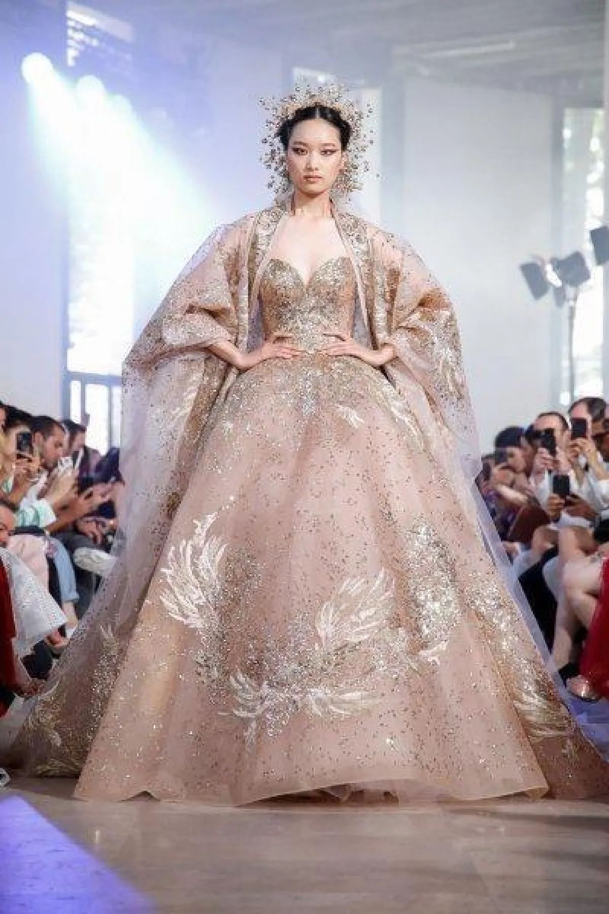 قدم المصمم اللبناني ايلي صعب Elie Saab فستان منفوش ومرصع ببريق الذهبي مع سترة إضافية مفتوحة من الأمام.
