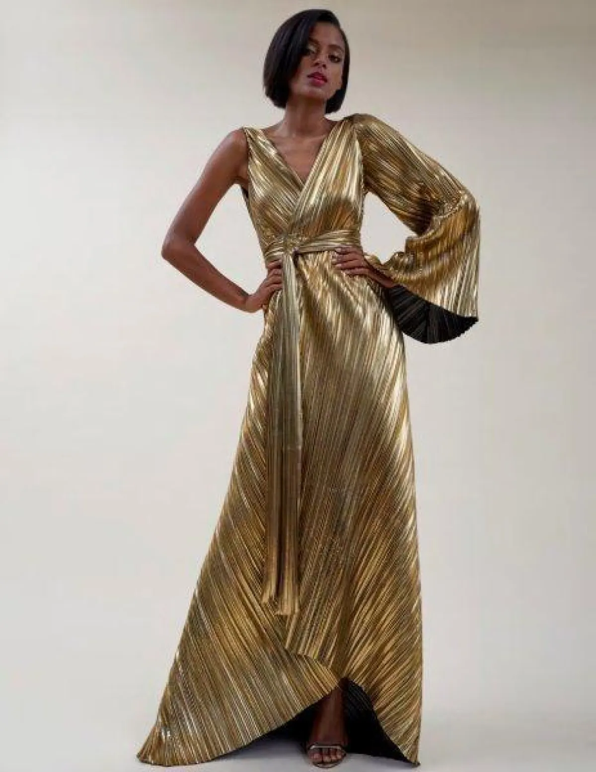 برزت الفساتين الذهبي بتنورة الثنيات والطيّات مثل فساتين رالف لورين Ralph Lauren، و ديور Dior وSemSem.