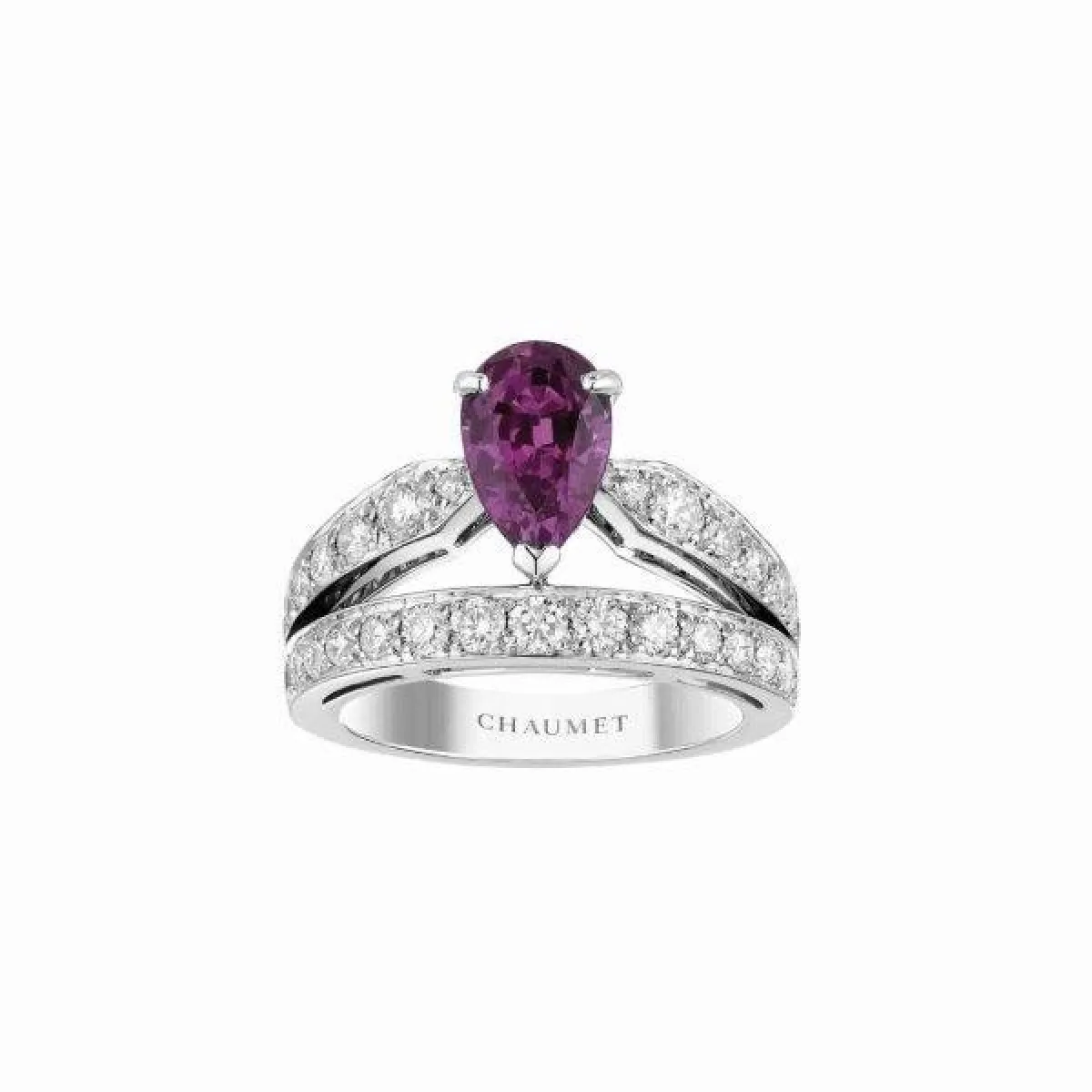 تنوعت خواتم شوبارد Chopard لترضي مختلف الأذواق، مثل الخاتم الذهب الأبيض المرصع بالألماس ويتوسطه حجر أرجواني كبير بقطع الإجاصة.