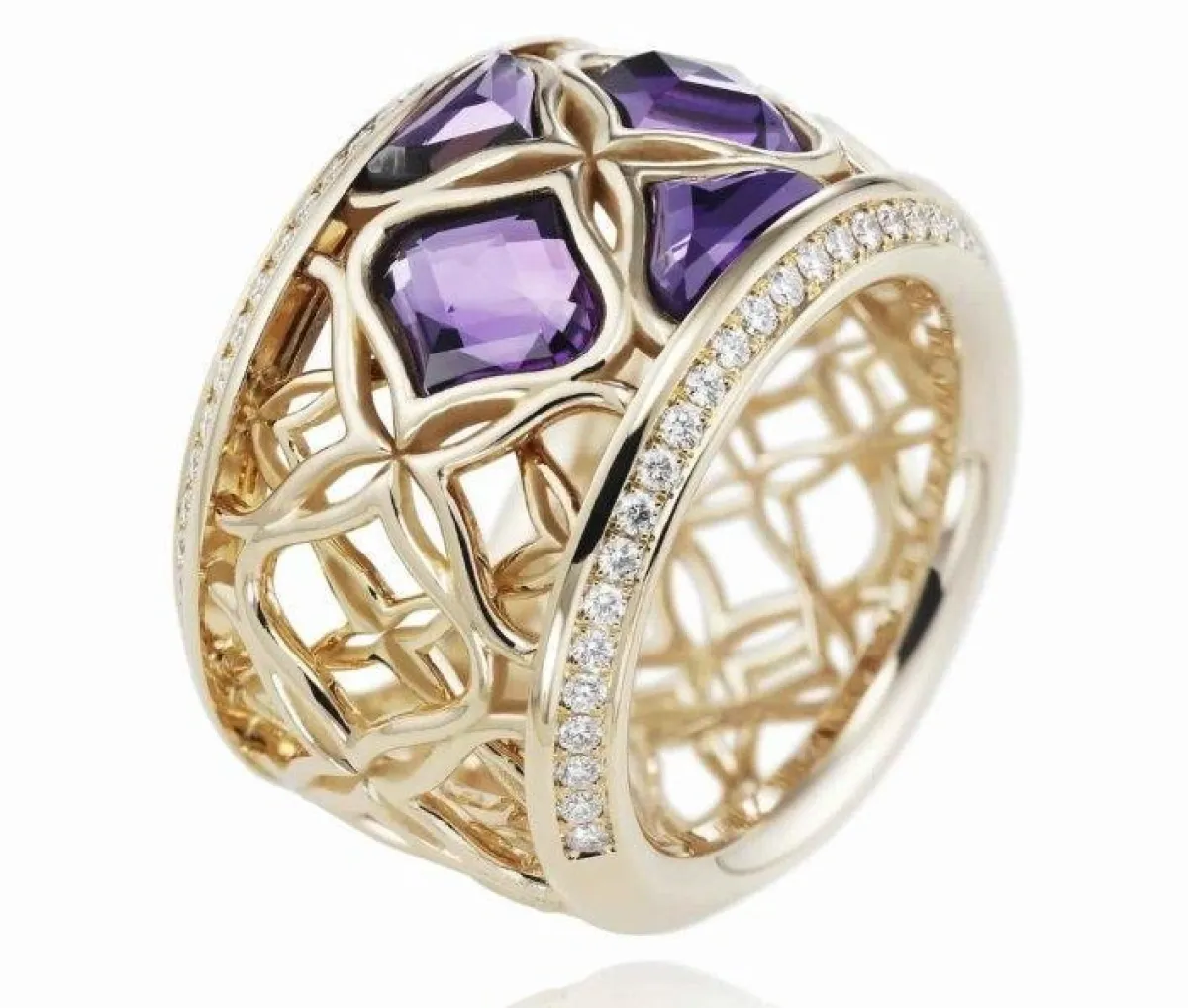 كما قدمت الماركة خواتم عريضة من الذهب الأبيض والوردي ومرصعة بالأحجار الأرجواني.