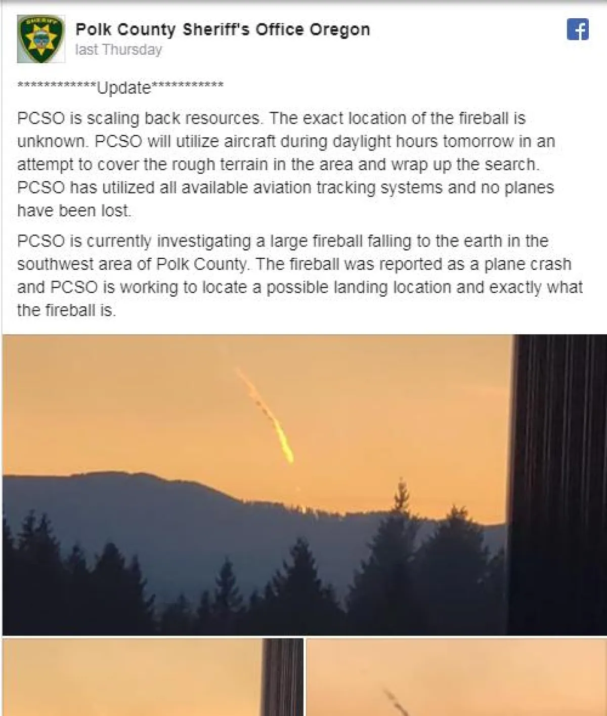 وبدأ هذا الجدل الواسع عندما وصلت مكتب الشرطة، في مقاطعة بولك في ولاية أوريغون، مكالمة هاتفية مساء يوم الخميس الماضي 21 من تشرين الثاني/نوفمبر، تفيد بتحطم جسم سقط من السماء غرب المقاطعة الأمريكية، وأنه قد يكون طائرة. وبعد الاتصال، قام الرجل الذي أبلغ الشرطة، بإرسال عدة صور تظهر الحادثة، وفيها توجد خطوط بيضاء في السماء خلفتها الكرة النارية الساقطة.