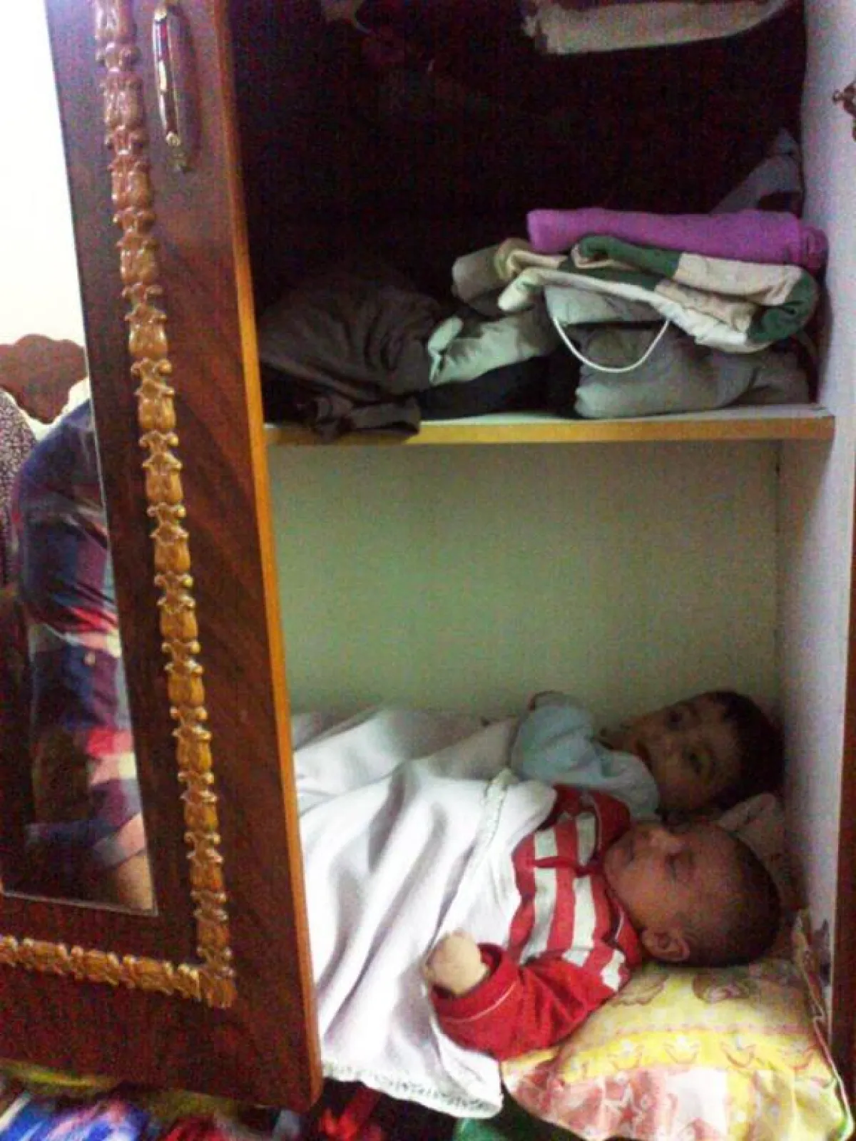 ليس ترفاً ولا شذوذاً من ذويهما، بل الأمر مختلف تماماً فالطفلان "غزل" و"يزن" ينامان في خزانة الملابس منذ مولدهما، والسبب هو أن البيت كله عبارة عن غرفة واحدة من "الزينكو"، حيث تعمها البرودة ومياة الأمطار.
