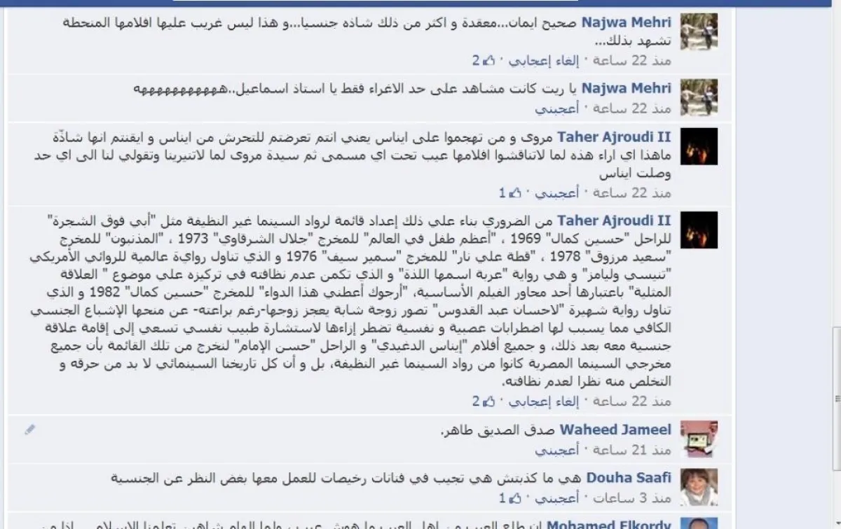 ثم عقّب Taher Ajroudi II بالقول: "من الضروريّ بناءً على ذلك إعداد قائمة لرواد السينما غير النظيفة، مثل "أبي فوق الشجرة" للراحل "حسين كمال" 1969، و"أعظم طفل في العالم" للمخرج "جلال الشرقاوي" 1973، و"المذنبون" للمخرج "سعيد مرزوق" 1978، و"قطة على نار" للمخرج "سمير سيف" 1976، والذي تناول رواية عالميّة للروائي الأمريكيّ "تنيسي وليامز"، وهي رواية "عربة اسمها اللذة"، و"أرجوك أعطني هذا الدواء" للمخرج "حسين كمال" 1982، والذي تناول رواية شهيرة "لإحسان عبد القدوس" تصوّر زوجة شابة يعجز زوجها ـ رغم براعته ـ عن منحها الإشباع الجنسيّ الكافيّ، ما يُسبّب لها اضطرابات عصبيّة ونفسيّة، تضطر إزاءها إلى استشارة طبيب نفسيّ تسعى إلى إقامة علاقة جنسيّة معه بعد ذلك.