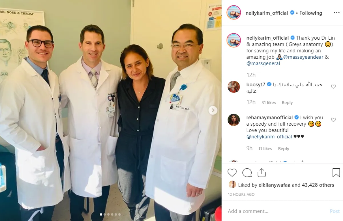 نيللي اعتبرت التدخل الجراحي وسيلة لإنقاذ حياتها واللافت إنها وجهت الشكر لفريق متخصص في جراحات العين والأذن، ولكنها بنفس الوقت اشارت إلى المجمع الطبي الكبير Massachusetts General Hospital، علما أن كريم اعترفت سابقا بأنها مدخنة شرهة للسجائر.