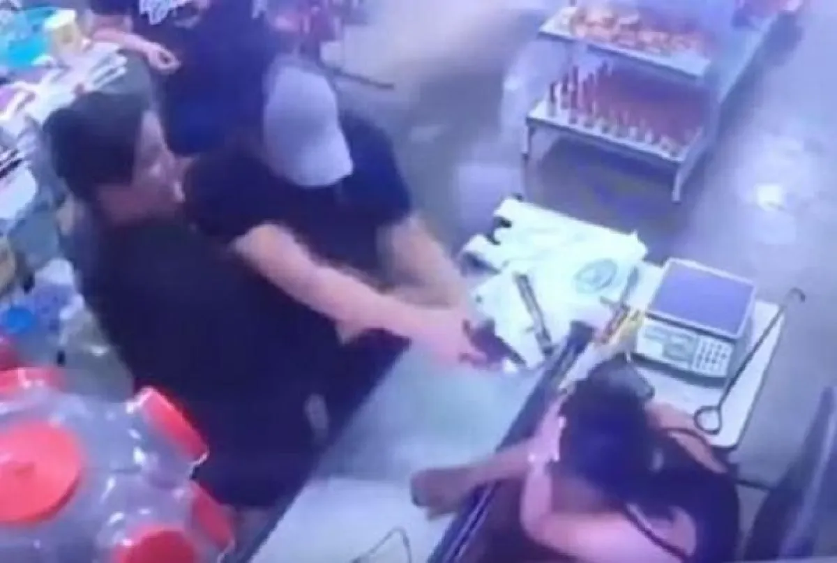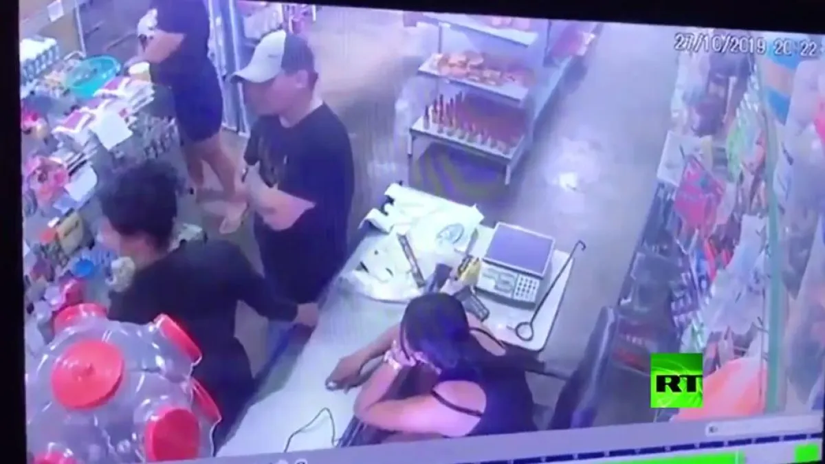 ويظهر في الفيديو الرجل وهو يتكلم مع المرأة " زوجته" التي تعمل في احد المحلات التجارية ، وفجأة اخرج مسدسه وصوبه على رأسها ، وبعدها تدخلت سيدة كانت تقف بجانبه وتعاركت معه ، وسحبته بعيداً ، وانطلقت رصاصه من مسدسه نحو الهواء .