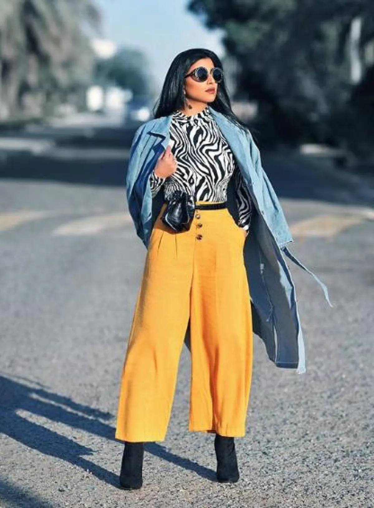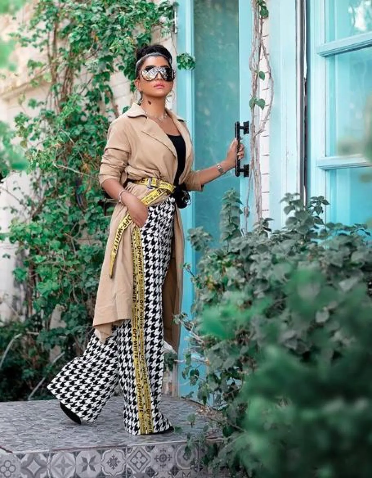 هنا نسقت بثية الرئيسي الترانشكوت بأسلوب لافت ومبتكر، حيث إنها بدايةً اختارته بتصميمه ولونه البيج الكلاسيكي، لكنها زينته بحزام عصري باللون الأصفر من أوف وايت Off-White ونسقت من تحته توب سوداء وبنطلونًا بقصة أرجل واسعة بنقشة باللونين الأبيض والأسود، وأكملت اللوك بنظارات شمسية كبيرة.