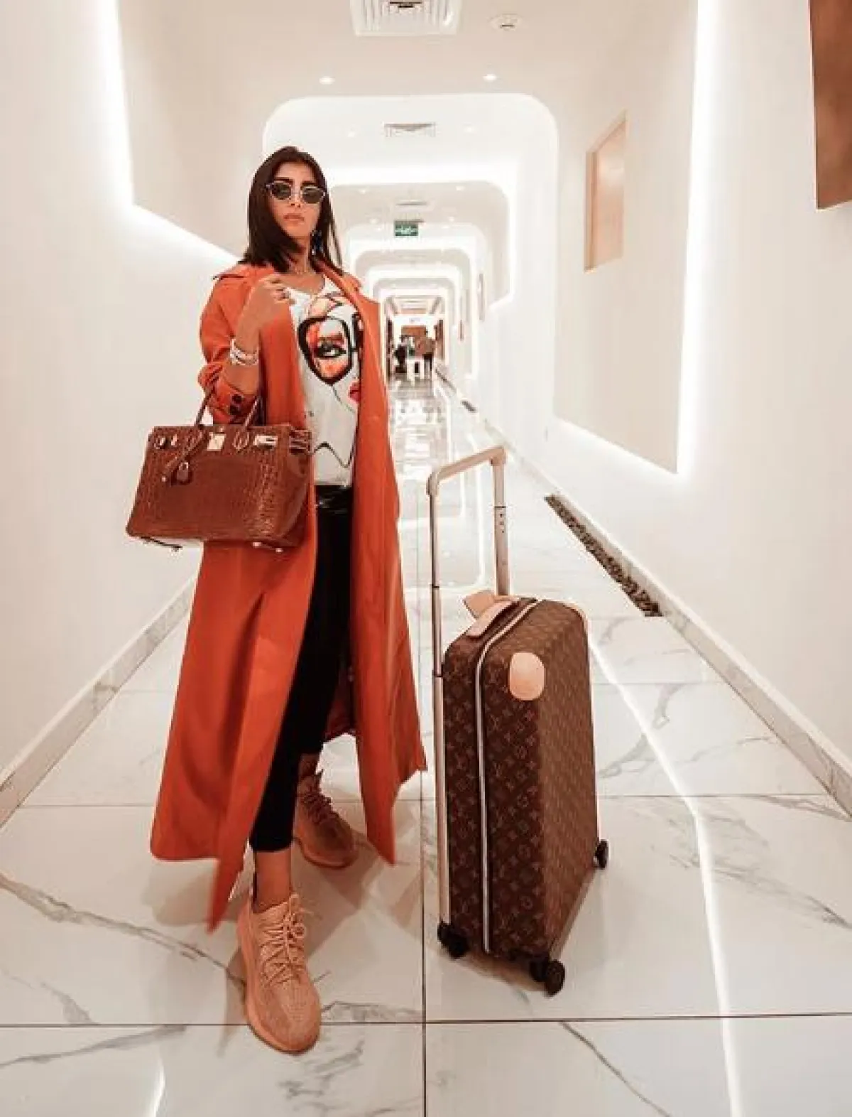 شاهدنا بثينة الرئيسي في اطلالة كاجوال نسقتها للسفر، اعتمدت فيها الأسلوب العصري المواكب للموضة، وقد اختارت ترانشكوت طويلًا باللون البرتقالي الهادئ، ونسقت من تحته تيشرت قطنية وسروالًا مطاطيًّا باللون الأسود، وأكملت اللوك بحذاء رياضي باللون البيج وشنطة يد من الجلد من هرمس Hermes، وحقيبة للسفر من لويس فويتون Louis Vuitton.
