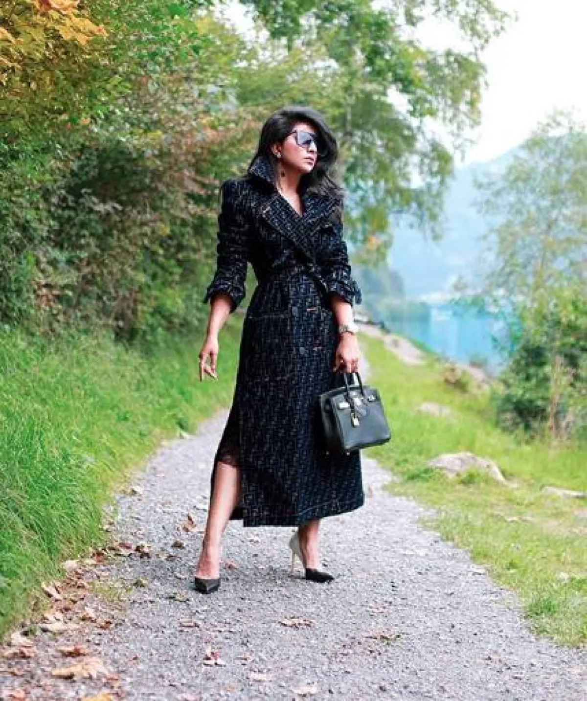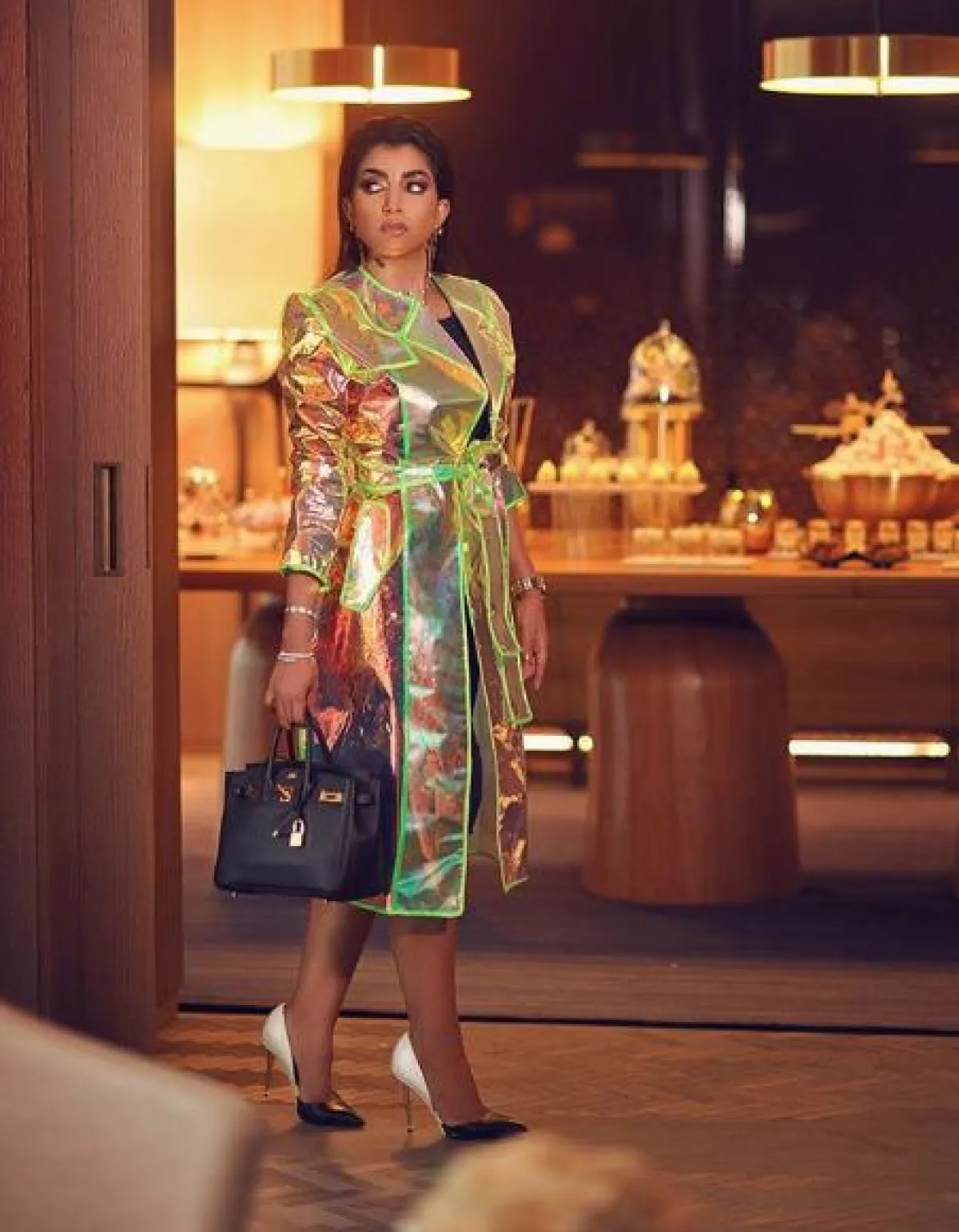 شاهدنا العديد من تصميمات الترانشكوت المبتكرة ضمن مجموعات دور الأزياء العالمية، مثل هذا التصميم الذي اختارته بثينة الرئيسي من قماش البلاستيك وبلون النيون المعدني، وقد نسقت من تحته فستانًا أسود وحذاءً بكعب عالٍ من توم فورد Tom Ford، وشنطة يد متوسطة الحجم من الجلد من هرمس Hermes.