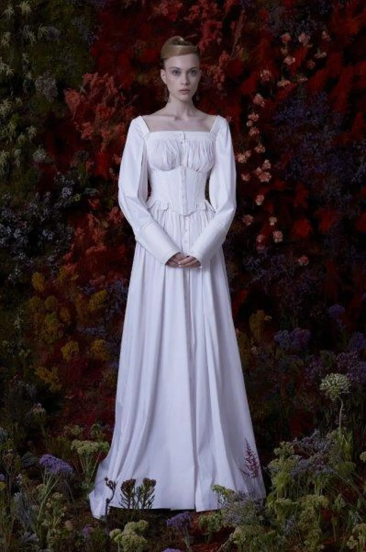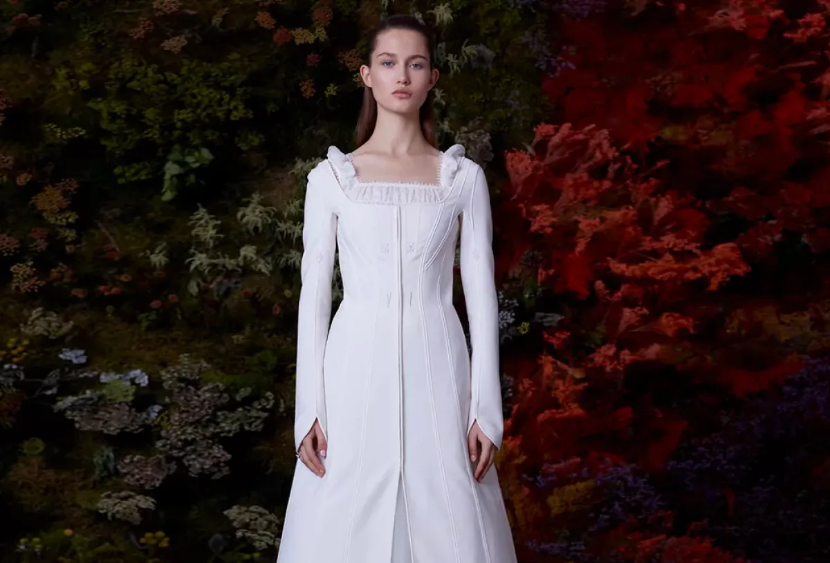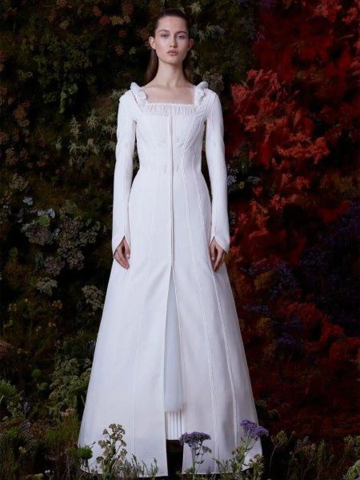 تصاميم كلاسيكية راقية قدمتها ماركة Edem للعروس بقصّة مربعة وأكمام طويلة مع تنورة A Line.