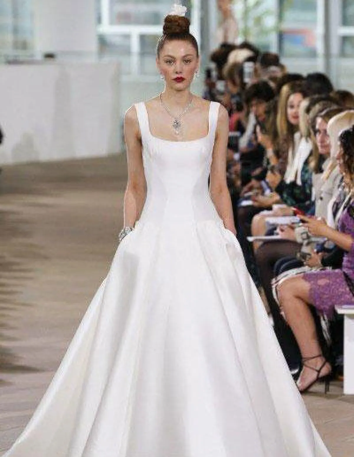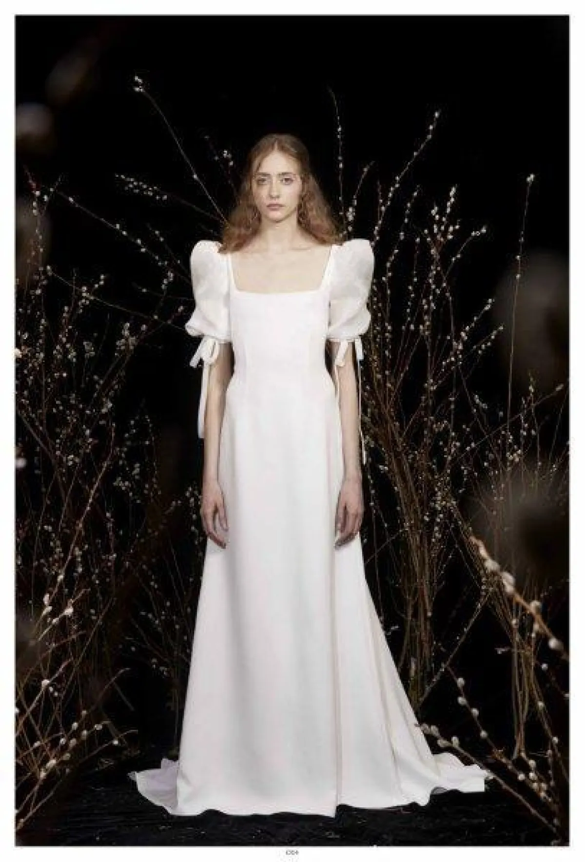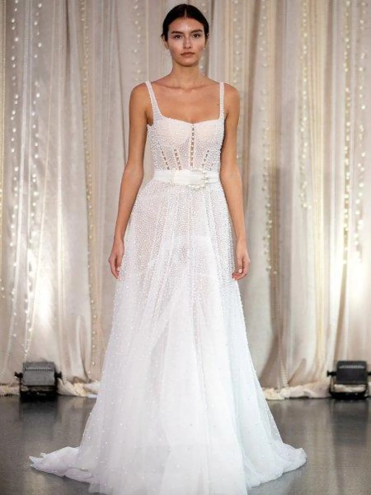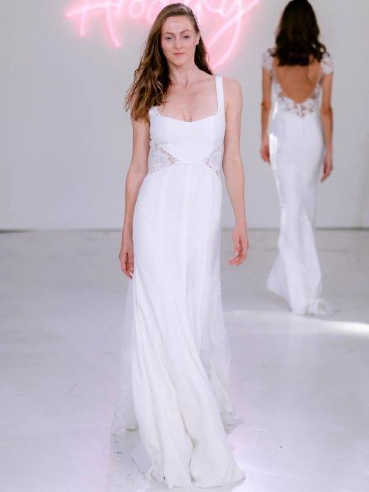وقدمت ماركة Lee Petra Grebenau فستان زفاف بقبّة مربعة وحمّالات مع تنورة A Line وحزام حول الخصر.