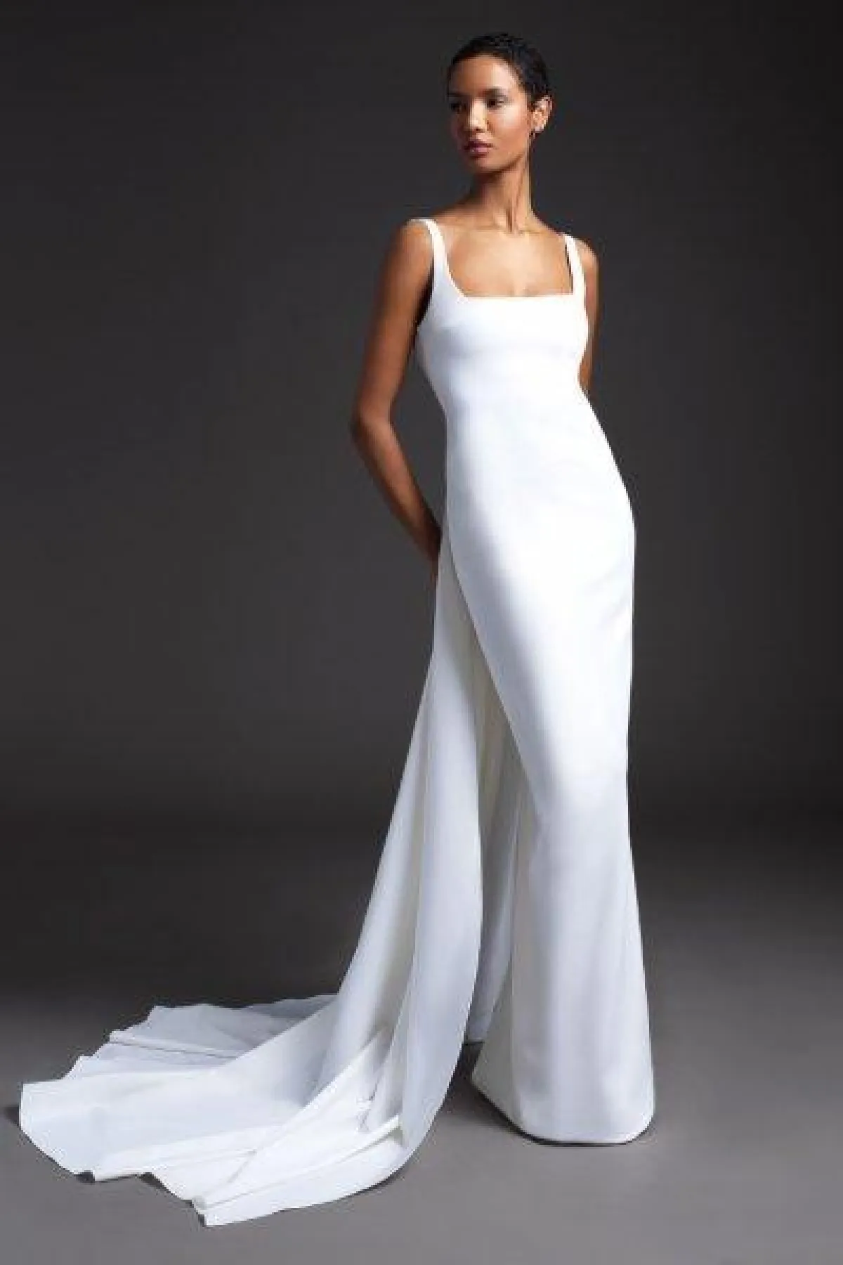 أما العروس التي تفضل التصاميم البسيطة والعصرية، يمكن أن تختار فستان زفاف ناعم بقصّة عمودية وبقبّة مربعة مثل فستان زفاف Rime Arodaky.